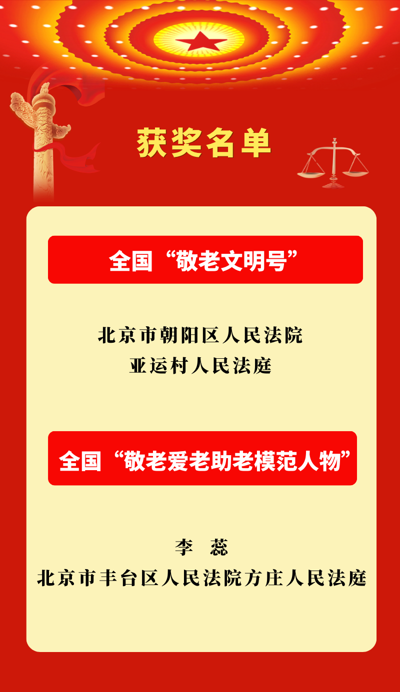 其中,北京市朝阳区人民法院亚运村人民法庭获全国“敬老文明号”,北京市丰台区人民法院方庄人民法庭李蕊获全国“敬老爱老助老模范人物”。