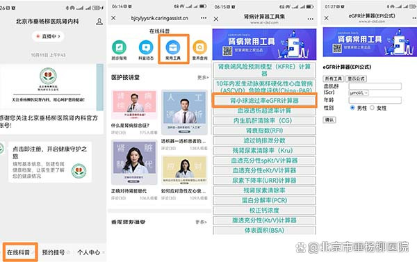 由于受到胖瘦、饮食等的影响,单纯通过血肌酐含量来反映肾小球滤过率其实并不可靠。有很多种方法来体现肾小球滤过率,其中最方便,也是最常用的是将患者的年龄、性别、体重、血肌酐含量或血胱抑素 C 等放入一种或几种公式里计算,得出每个患者的肾小球滤过率。所以,只要如实提供以上资料,医生会很快估算出患者的肾小球滤过率。手机或电脑都会提供一些 App 或程序来方便医生测算(图3)。因此,慢性肾脏病的分期一般是根据患者实际的肾小球滤过率来划分的。