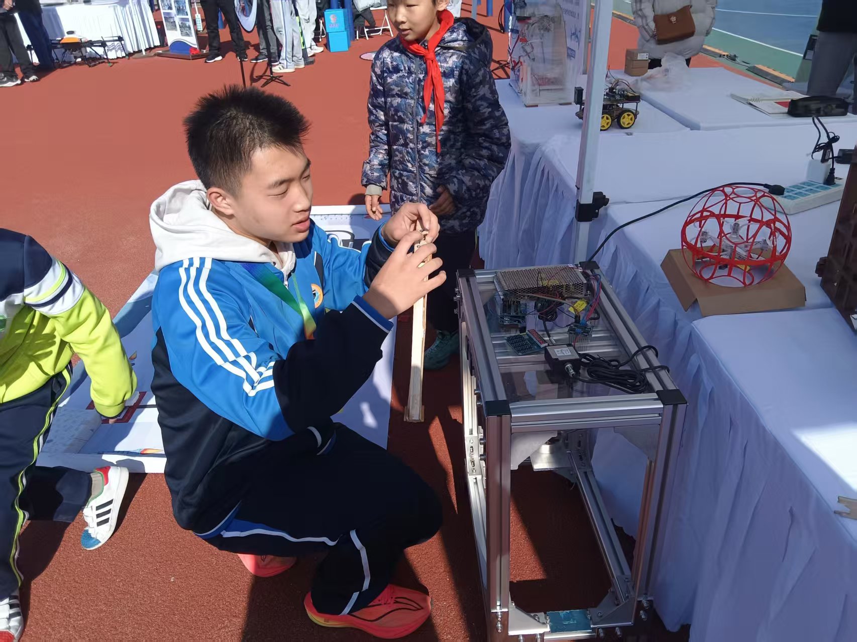 在科技节的科学市集上,贾宇豪在延庆区第二中学展位上为小学生们展示“木梁承重”科技项目。他与同学在不久前举办的第二十届全国青少年未来工程师博览与竞赛总决赛中学组“木梁承重”项目中获得二等奖。“承压测试中,我们设计制作的木梁不到50克,要承载200多公斤的重量。最后一次叫重,我们想冲击一等奖,可距离20秒的既定目标只差了三秒。”忆及比赛情景,贾宇豪不无遗憾。““二等奖不是终点,这段为热爱全力以赴的日子,才是青春里最亮的光。”贾宇豪说。