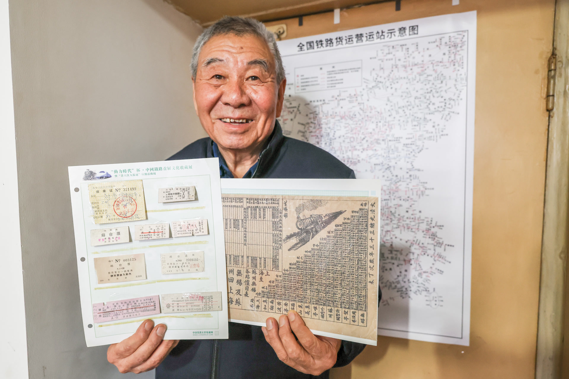 话匣子与纸箱子一同打开。“干了一辈子铁路,只要见到与铁路有关的东西,就想收藏起来。”清代的铁路时刻表、民国的铁路报纸、“毛泽东号”机车纪念章模具,各式各样的火车线路图、火车票、信号灯、搪瓷缸、车门钥匙、票剪,还有与铁路有关的徽章、邮票、肩章、胸卡、臂章……与共和国同龄的刘振起说起自己的“宝贝”,言语间透着自豪。“加上各处正在展览的老物件儿,我差不多已有12万件铁路藏品了,其中八成以上都是铁路票据。”