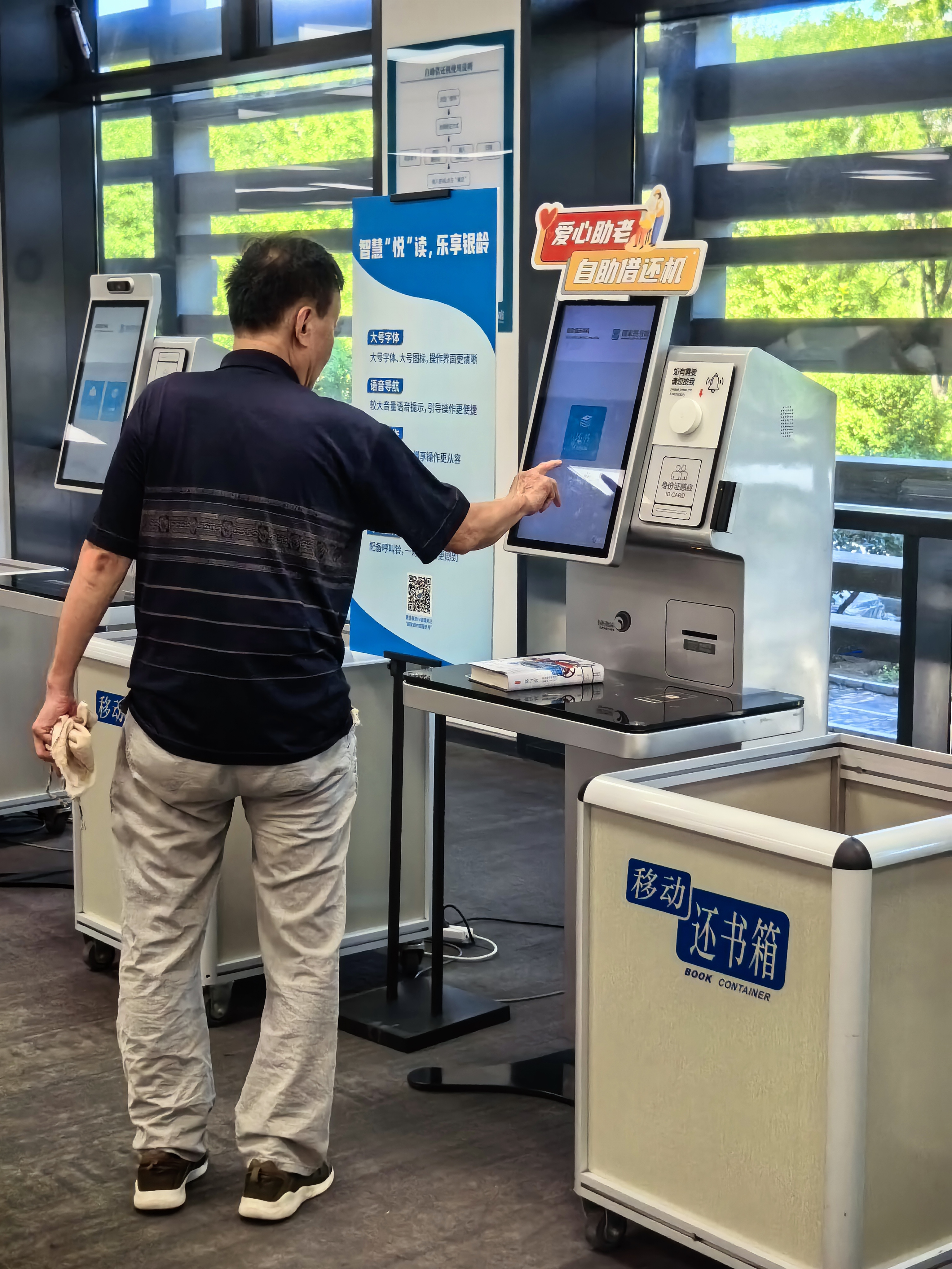 为了更好地适应老年读者借阅需求,国家图书馆总馆北区中文图书区近期对阅览室部分自助借还设备进行了适老化升级改造。升级措施包括操作界面采用大号字体和大号图标、增加语音导航、延长操作等待时间等,并在设备上配备呼叫铃,确保为在老年读者遇到借阅问题时,及时提供帮助。