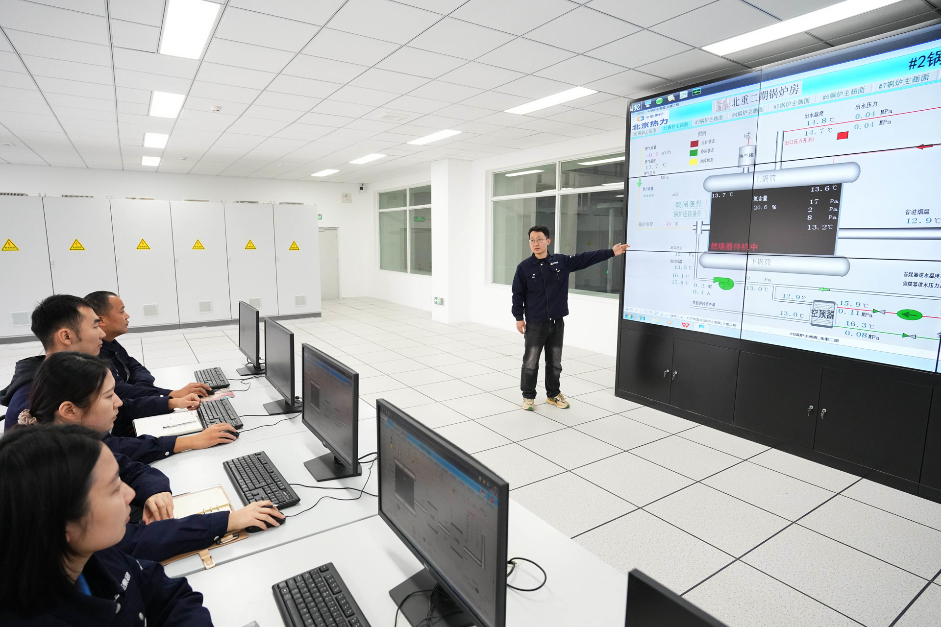 北京热力生产调度中心大厅中,工作人员正全神贯注紧盯调度大屏上不断变动的参数,确保供热系统平稳运行。一旦发现异常,工作人员将第一时间发布指令,对系统进行实时调节。