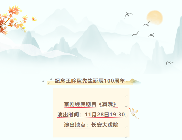 为纪念著名程派表演艺术家、程砚秋大师嫡传弟子王吟秋先生诞辰 100 周年,北京京剧院领衔主演、著名程派表演艺术家迟小秋将于11月28日19:30在长安大戏院演出程派经典剧目《窦娥》,以此剧向王吟秋先生致敬。