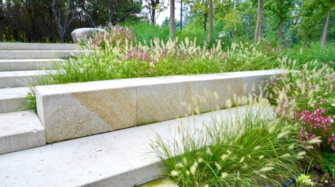 台地广场:将原本陡峭的上坡改造为台地广场空间,在保留原有乔木的基础上栽种新的花卉,并采用荔枝面黄锈石花岗岩贴心设计了休息石凳,让游客入园过程轻松从容。