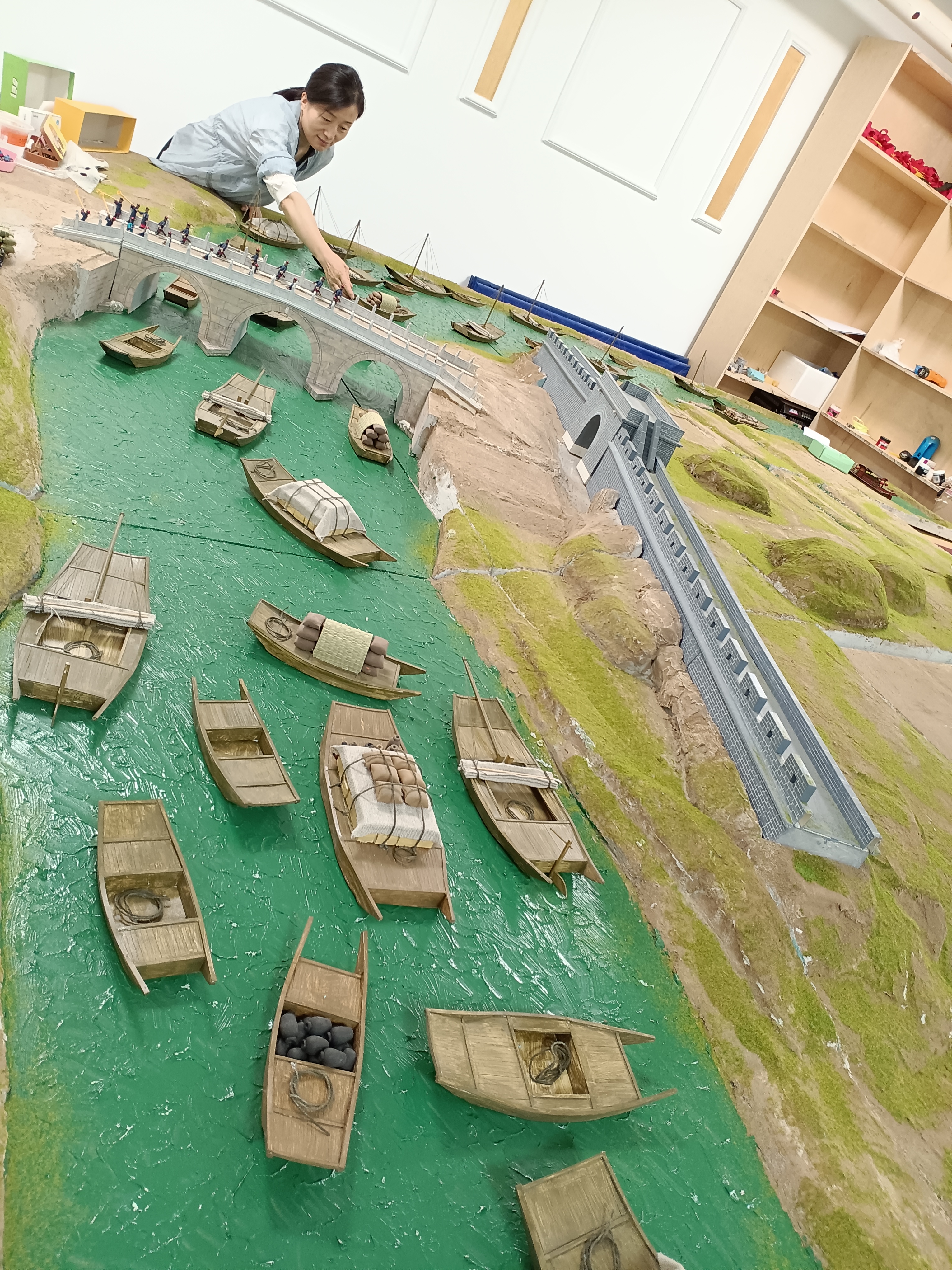2021年,为了扩大面塑的影响力,也因为本身是通州人,深切体会到通州近些年来的飞速发展。陈艳玲和老师徐世英一拍即合,决定用面塑技艺重现大运河故事。对于作品中的建筑,如通运桥、城墙等,她多次到实地观察测量,最终设计出底稿,再采用厚纸板进行制作,最后上色做旧。完成了通运桥、城门城墙、船只、人物的制作后,她又开始还原地貌和水流,最后再进行布景。