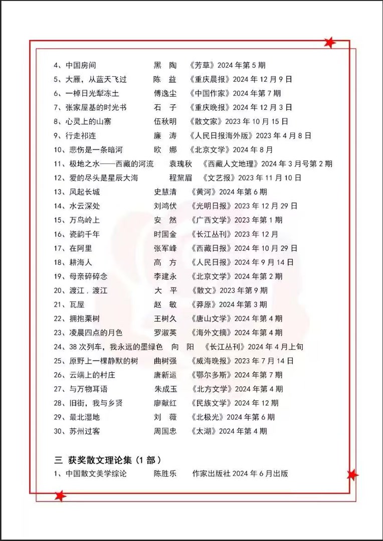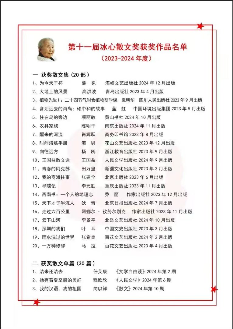 第十一届冰心散文奖(2023-2024年度)于2025年3月1日启动,截至4月30日,共收到散文单篇作品756篇、散文集339部。参评作品题材广泛,涵盖生态保护、乡村振兴、文旅融合、历史人文、城市建设、民族风情、亲情怀旧等领域,具有鲜明的时代性、历史性、文学性,体现着广泛的群众参与性。其中,著名学者,评论家谢冕《为今天干杯》等20部作品获得散文集奖;中国文艺评论家协会理事向阳《38次,永远的墨绿色》等30篇作品获得散文单篇奖;陈胜乐《中国散文美学综论》获得散文理论奖。