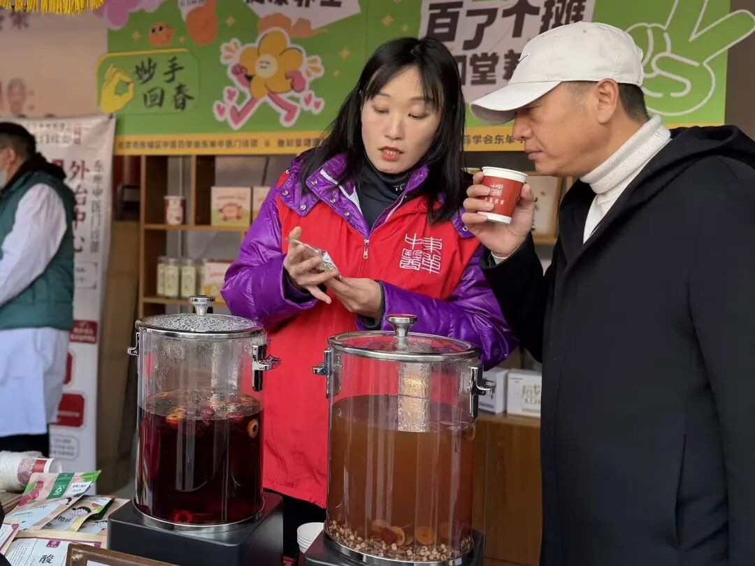 同仁堂医养集团的摊位上,众多代茶饮分装在透明茶罐中,工作人员不时为市民斟茶试喝:“这款清咽润喉茶由胖大海搭配山楂等药材,秋天喝能缓解咽喉不适。”其他摊位上销售的八珍桃酥、茯苓面包、山楂丸等产品琳琅满目,不少家长带着孩子挑选健康零食。