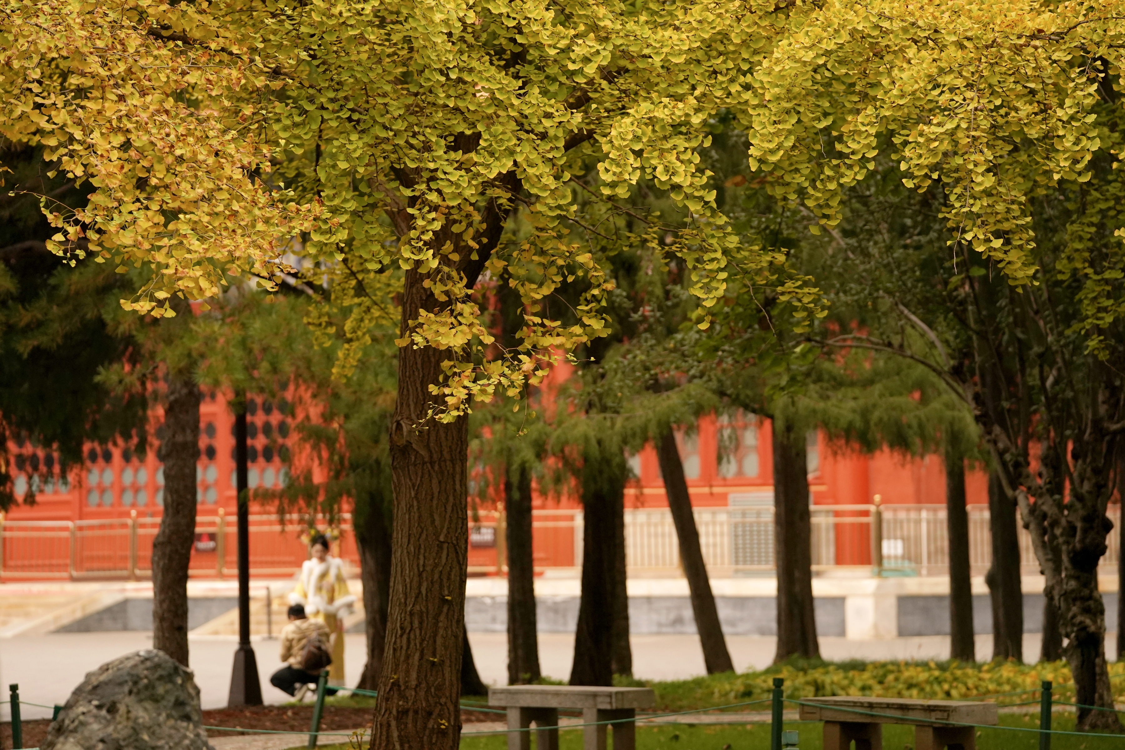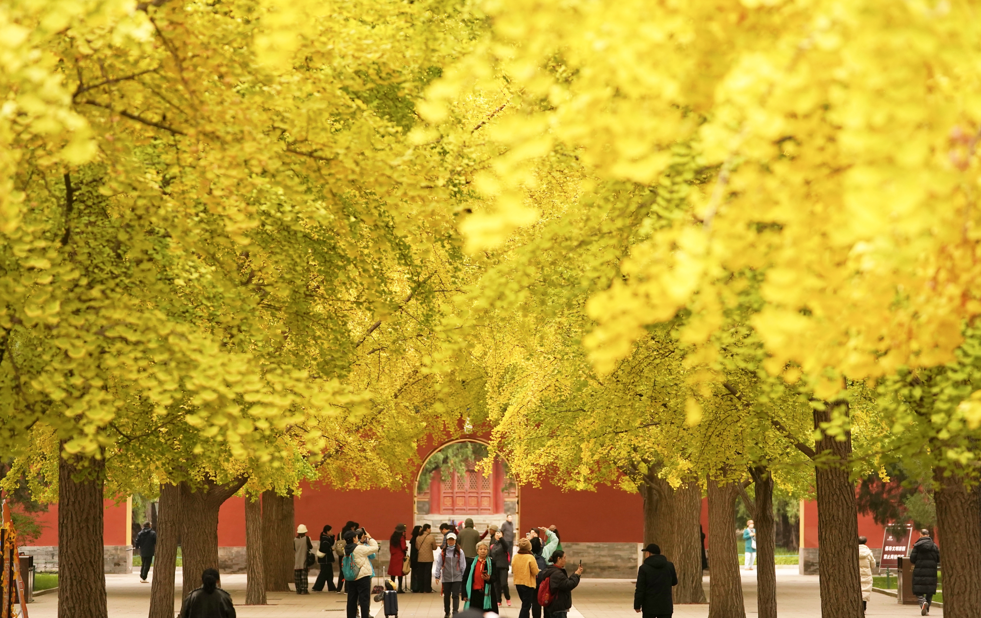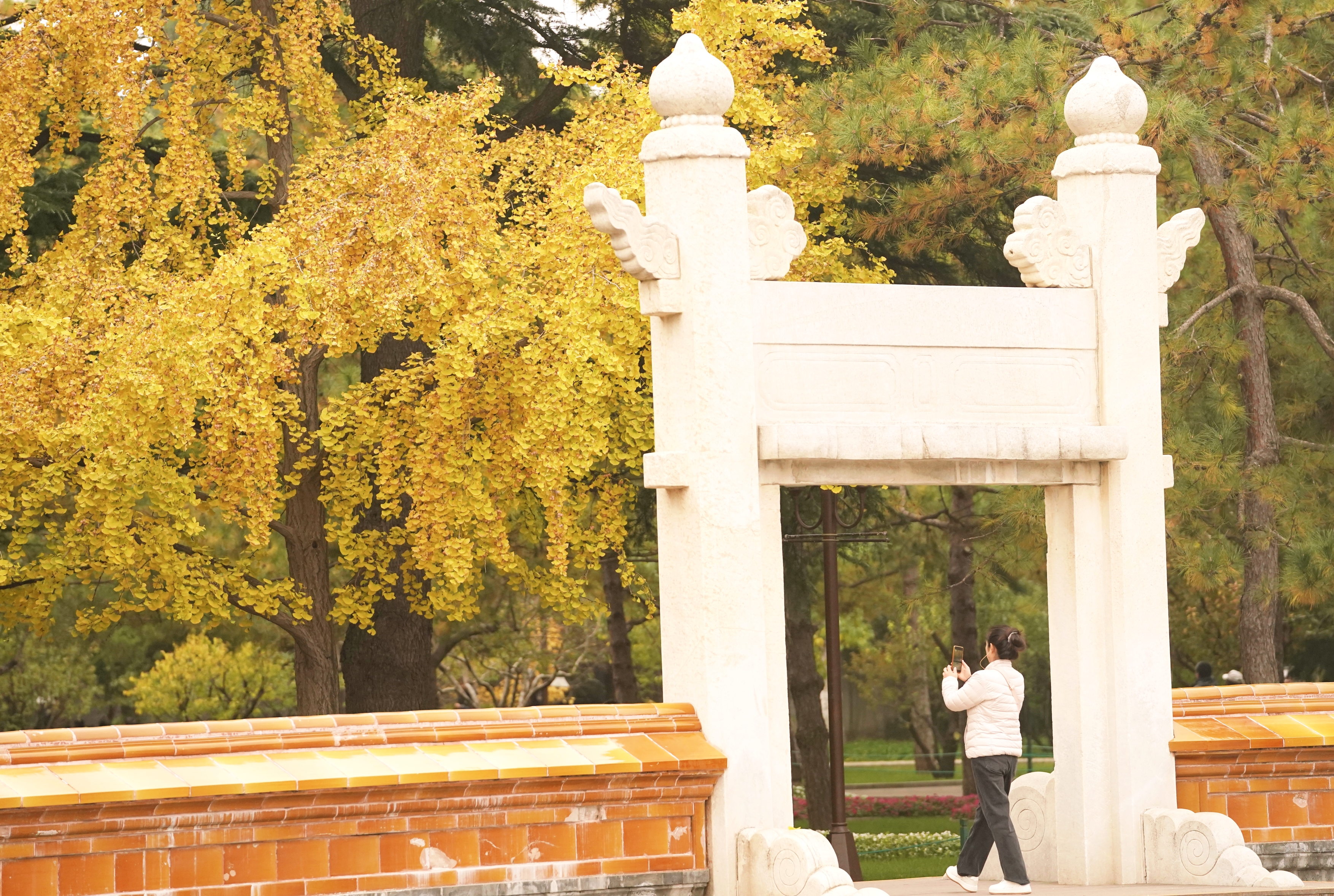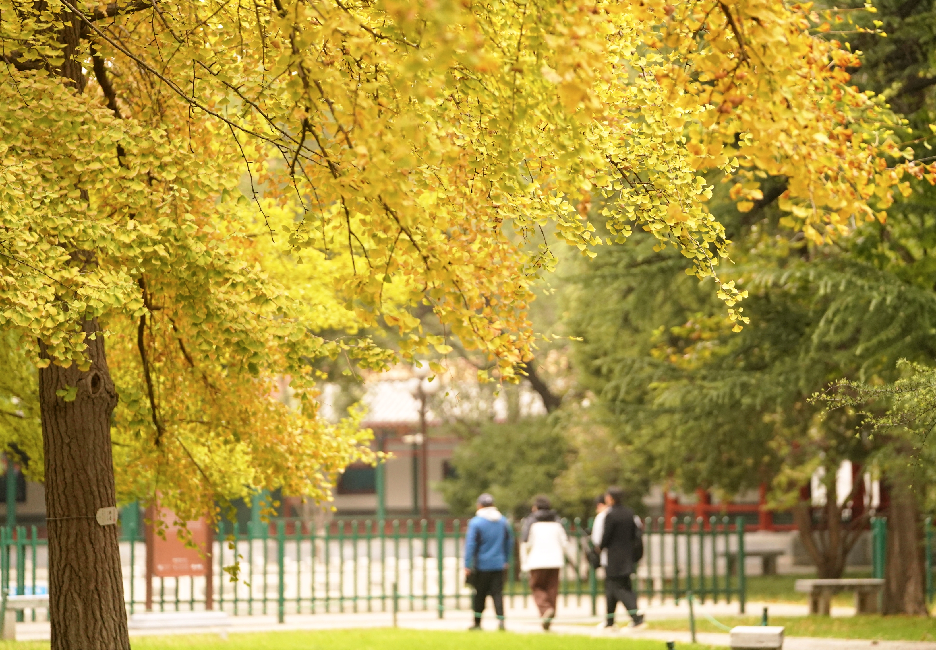 近日,中山公园褪去葱郁,换上斑斓秋装,满园秋色吸引市民游客前来打卡赏景。园内,金黄的银杏叶衬着古朴园景随风轻舞,呈现秋的色彩画卷。