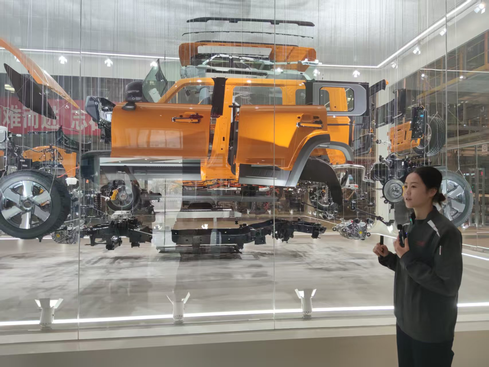 北京越野智能工厂讲解员肖梦竹介绍,工厂拥有完整的冲压、焊接、涂装、总装四大工艺。总装车间主要有内饰线、底盘线、最终线、检测线,生产线高度柔性化与智能化,支持所有越野车型混线装配。