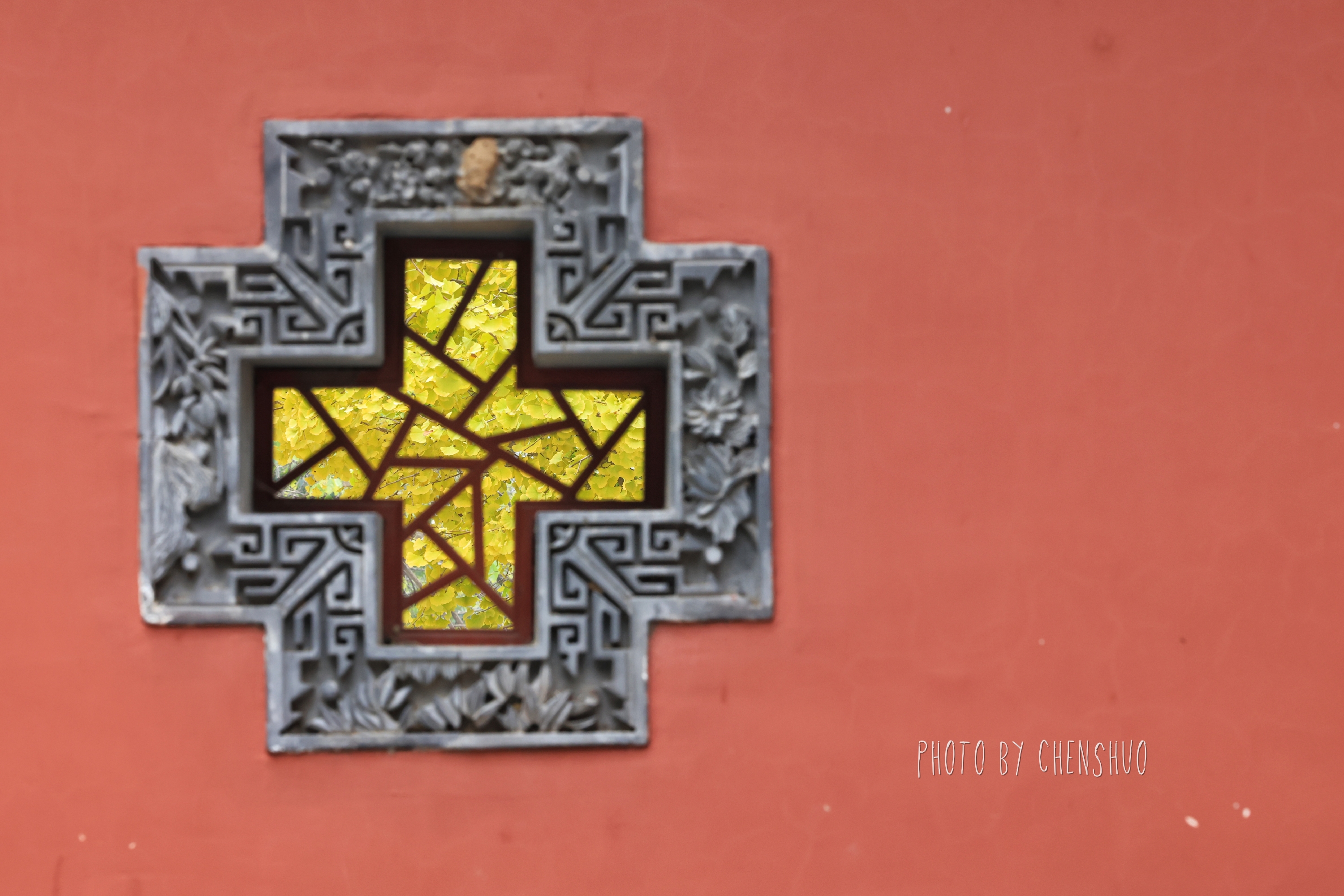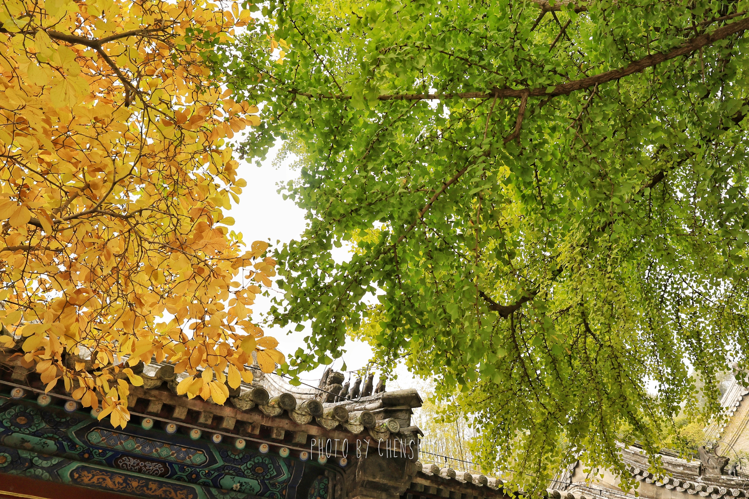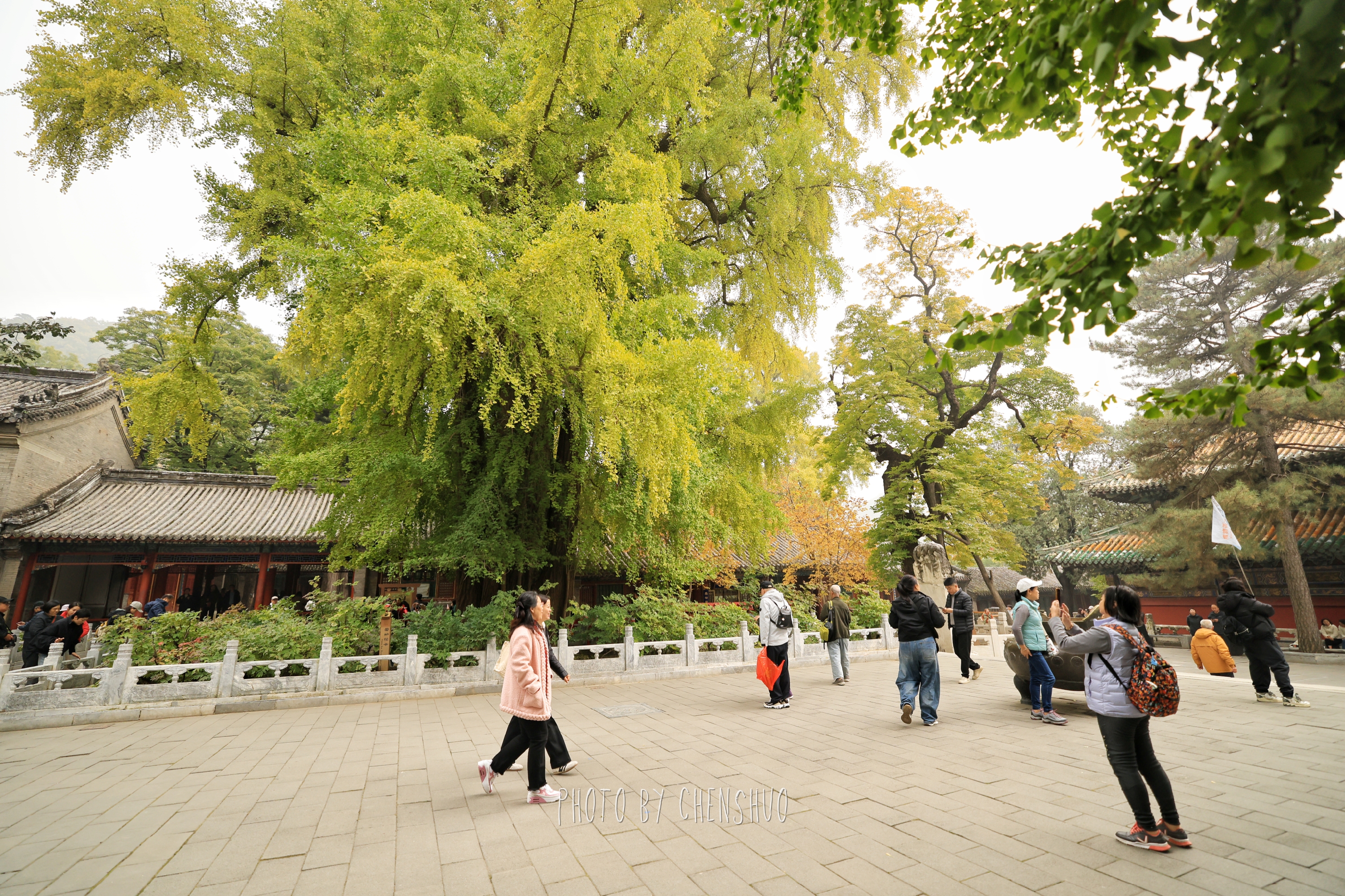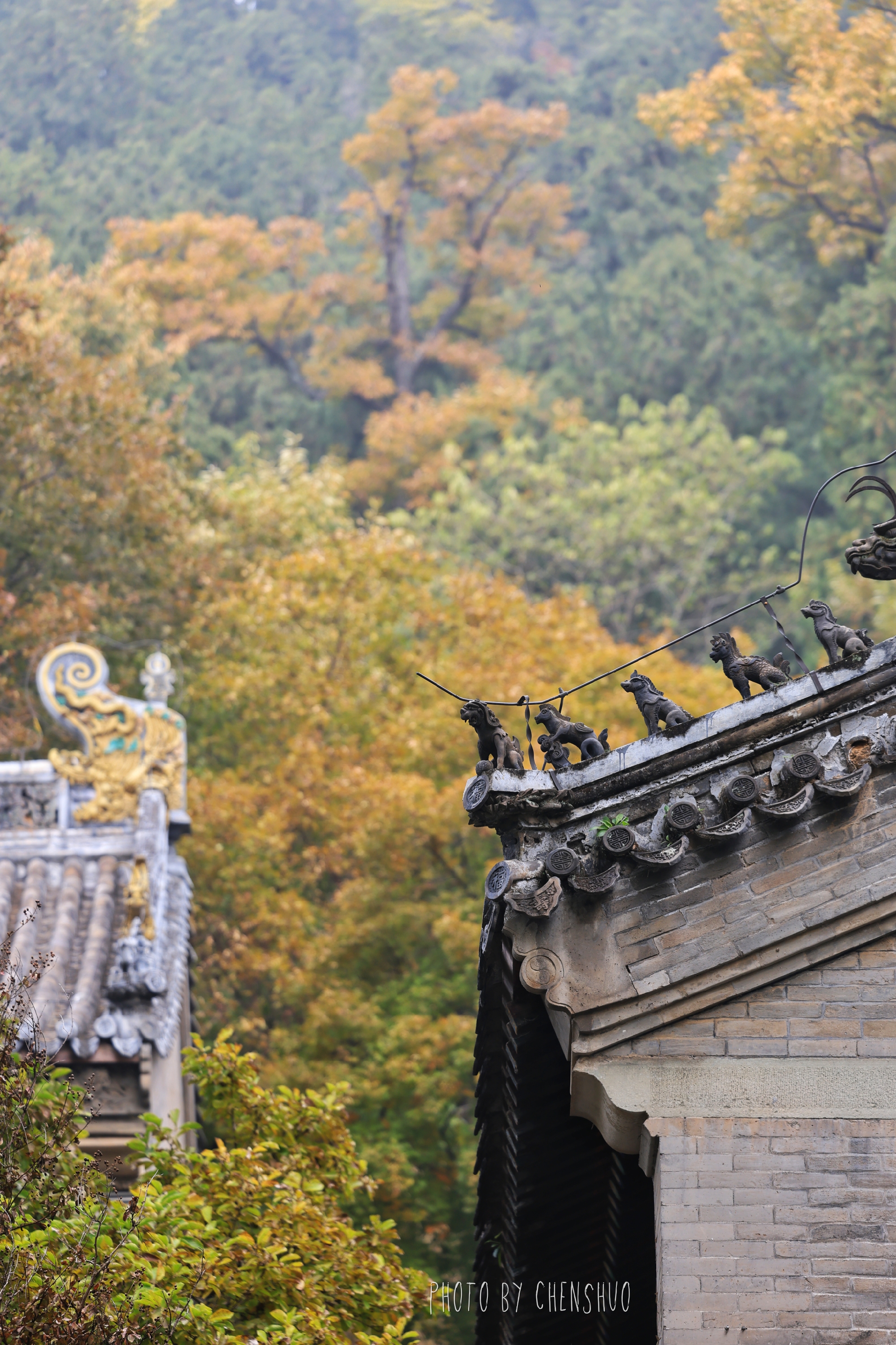 漫步寺院小径,高大的银杏树正渐渐披上金黄,叶片边缘已泛着暖光,却还未飘落,像在为即将到来的“金色地毯”积蓄力量;山间黄栌已染成深浅不一的红色,与松柏的墨绿交织成层次丰富的画卷。阳光透过枝叶洒落,光影斑驳间,古碑、石狮、飞檐都披上了温暖的色调。