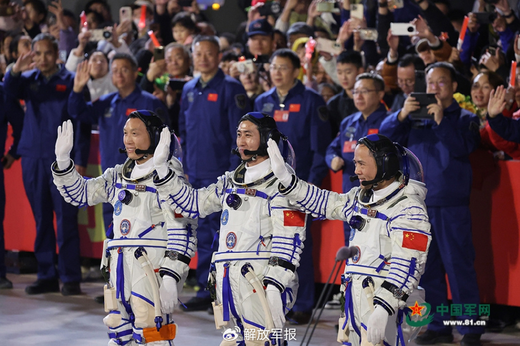 这一刻,飘扬的国旗、乳白色的航天服与无数期盼的目光交汇,三位航天员怀着共同的飞天梦想与崇高使命,步履坚定。