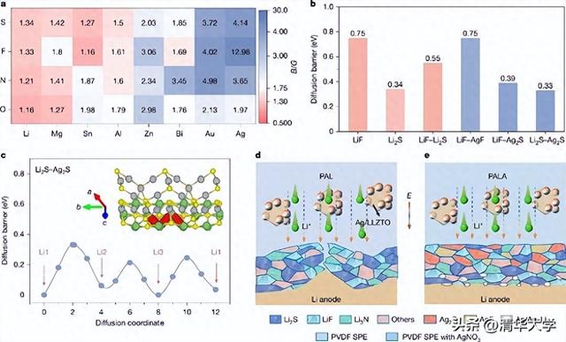 研究团队从SEI结构和模型进行源头创新,摒弃传统SEI“唯强度论”的结构模型和设计理念,将“塑性”特征作为新型SEI组分筛选的核心指标,以Pugh准则为塑性判据(B/G比值≥1.75表明组分具有塑性,其中B为体模量,G为剪切模量),通过对一系列潜在无机物进行了人工智能加速的理论筛选,发现硫化银、氟化银等材料不仅具备良好的塑性变形能力,还能够显著降低锂离子的扩散能垒。