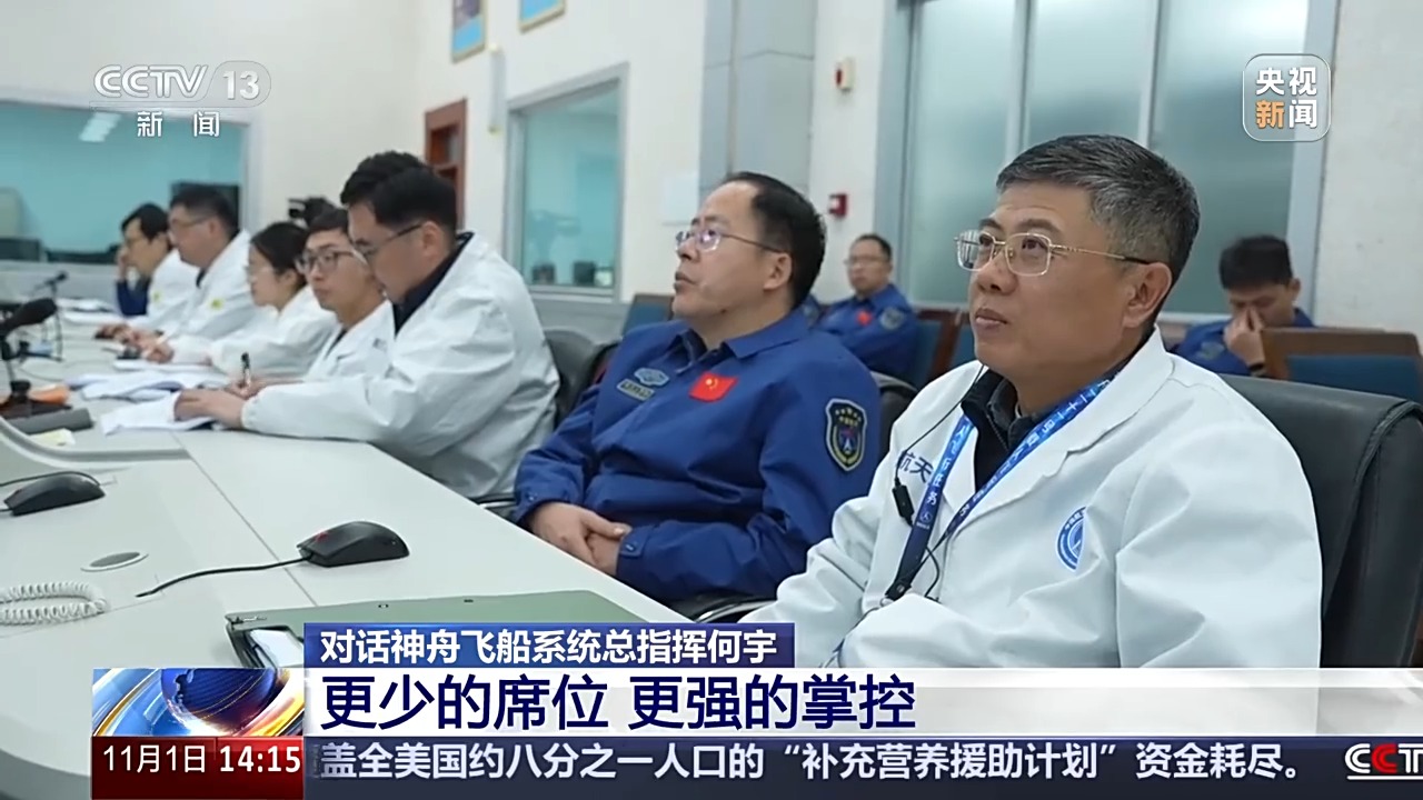 中国航天科技集团神舟飞船系统总指挥 何宇:得益于技术进步。在更早的时候,我们的数据和北京的数据是隔离的,北京飞控的数据在这是看不到的,现在得益于技术的进步,我们在这边能看到数据,能听到北京指挥控制中心的调度音。