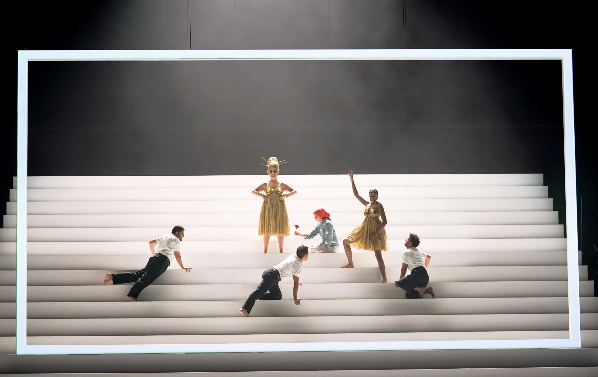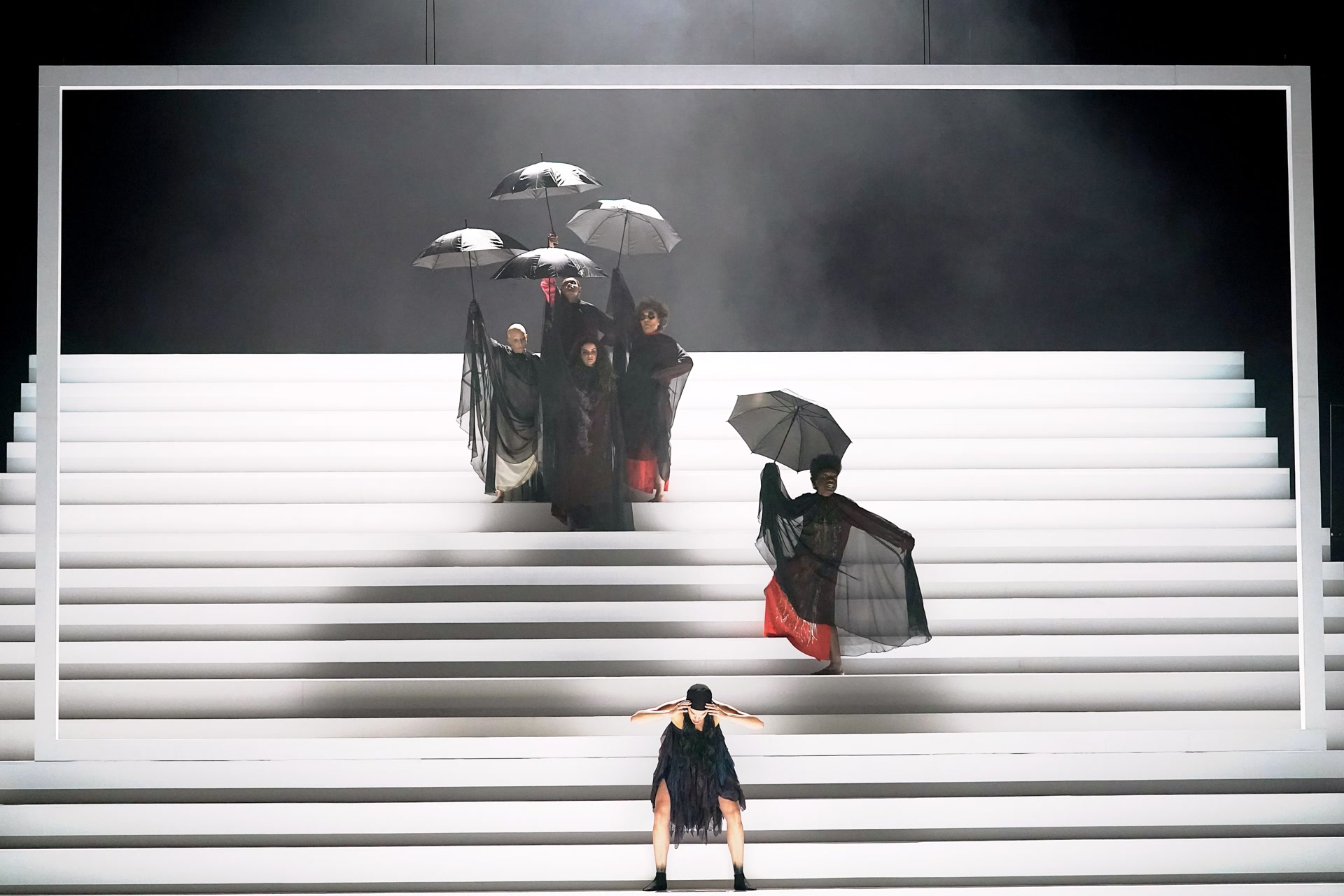坦诚说,《屏风》的观感绝对算不上轻松或愉快,碎片般的表达、冷峻的质感、尖锐的刺痛刻在这部作品的基因里——1966年,《屏风》在法国首演时,一度引发巨大的争议甚至冲突。让·热内运用多组布置于不同高度的屏风,制造不同的观看视野,每当屏风移动,看与被看、言说与审判之间关系不断转换,传递着辛辣的批判精神。2023年,法国布列塔尼国家剧院与见证《屏风》首演的法国奥德翁欧洲剧院联袂,再次制作《屏风》,担纲导演的法国布列塔尼国家剧院院长亚瑟·诺泽希尔一面保留高度忠实原作的台词,一边用高耸的阶梯取代屏风,为这部作品赋予了更具当代感的舞台视觉。