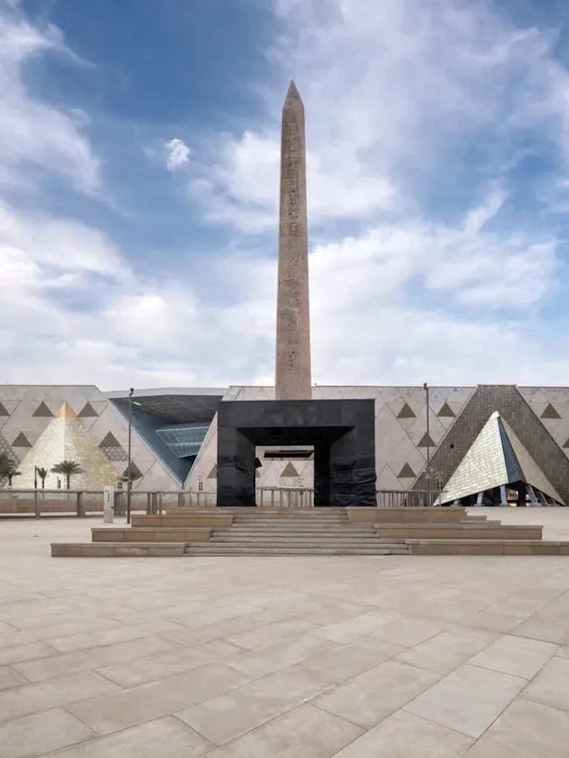 大埃及博物馆的建筑光滑如楔、外形锐利,石灰岩外立面上覆盖着互相嵌套的金字塔形图案,颇有几分机场或购物中心的模样,在棕榈树的掩映下,穿着制服的博物馆工作人员精神十足,高尔夫球车载着游客穿梭其间。