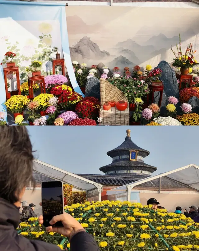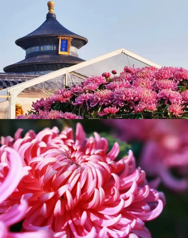 近日,天坛公园第44届菊花展在祈年殿景区盛大启幕,在祈年门南两侧6000平方米的广场上,万余株涵盖品种菊、大立菊、悬崖菊等多种类型的菊花竞相绽放,鲜艳如披油彩,为深秋的京城增添了无限风情。(图/天坛公园)