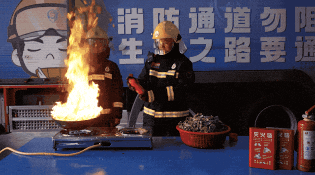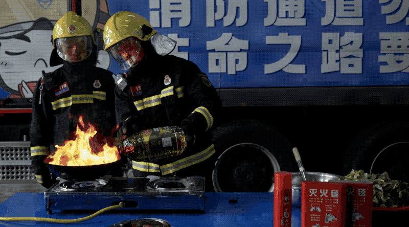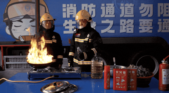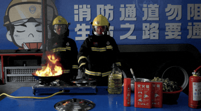 消防员将瓶装水倒入油锅