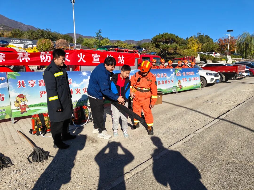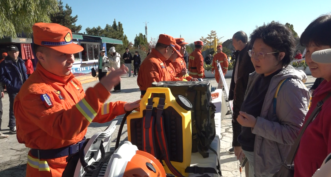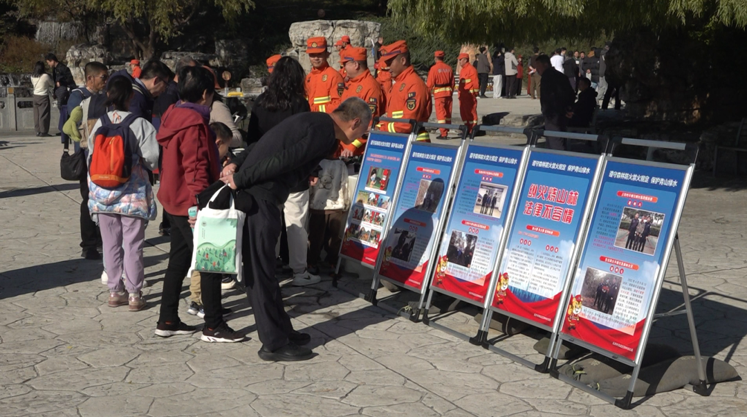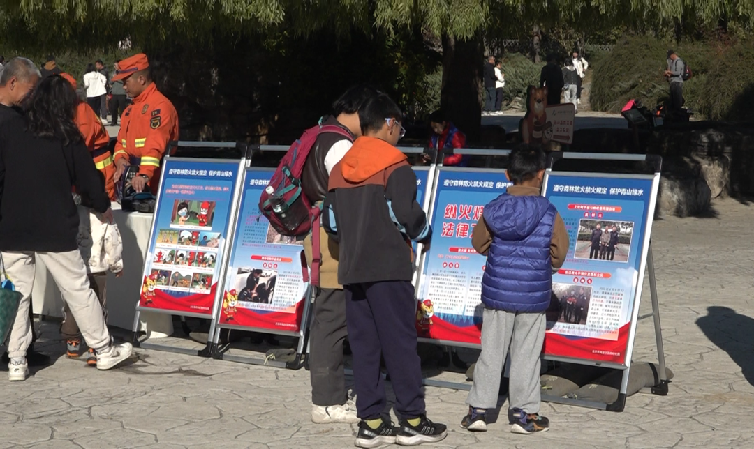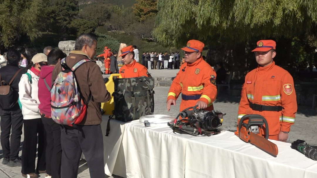 在国家西山森林公园主会场,国家消防救援局机动支队二大队六中队中队长王勇带领队员们向游客详细讲解防火规定。