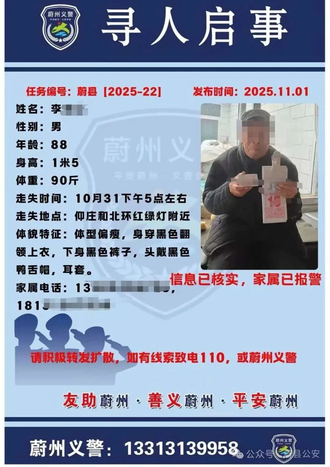10月31日下午,家住蔚县仰庄附近的88岁老人李某外出后迟迟未归。老人体型偏瘦,身着黑色翻领上衣、黑色裤子,头戴黑色鸭舌帽。家属发现老人走失后,心急如焚,立即报警求助。