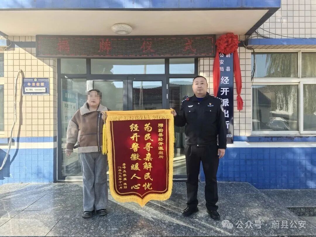 2025年11月2日下午,在蔚县公安局经开派出所的办公楼门口,老人家属紧紧握着民警的手,将一面写有“为民寻亲解民忧,经开警徽暖人心”的锦旗郑重递上,话语间满是感激。