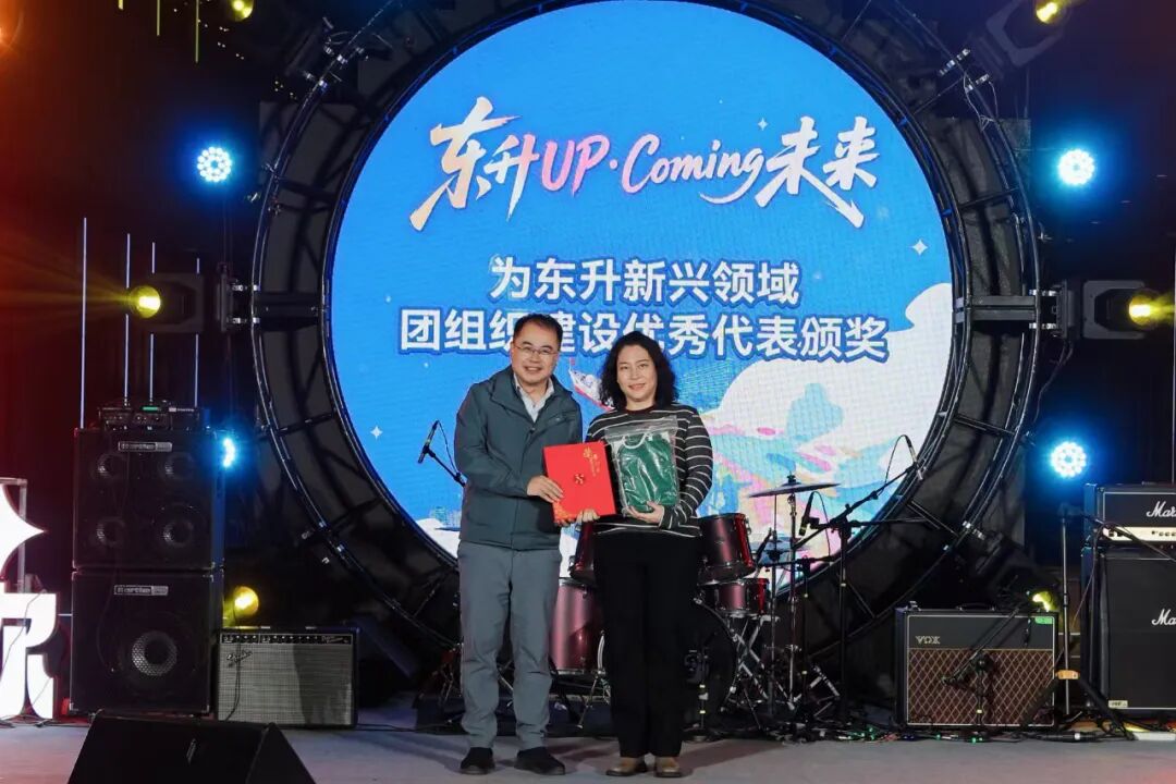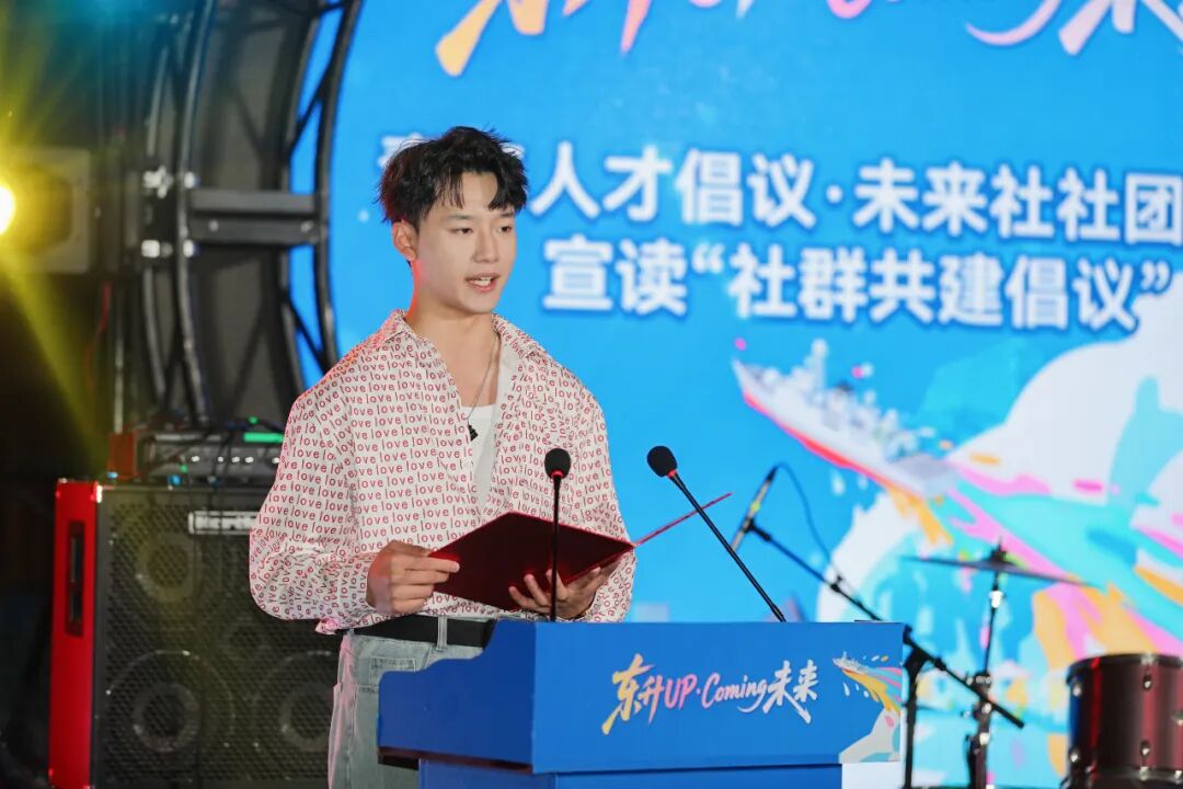 现场还为尚普咨询、华大生物、双高志信等企业代表颁发“青年人才服务伙伴企业公益讲师”聘书,并表彰了多位“海・青”优秀志愿者。并为东升新兴领域团组织建设优秀代表——北京六合华大基因科技有限公司支部颁发“北京青年团建工具包”,通过示范引领推动共青团组织和青年服务向新兴领域延伸覆盖,进一步增强团组织在新兴青年群体中的凝聚力和影响力。随后,与会领导共同为“UP・Coming未来社”授旗,北京科技大学青年代表接旗并宣读《社群共建倡议》,承诺以“开放、包容、互助、共进”的理念凝聚青年力量,助力区域发展。