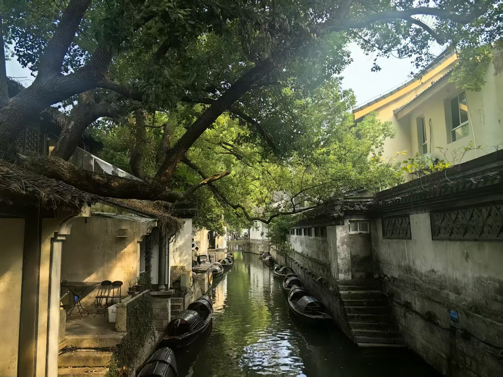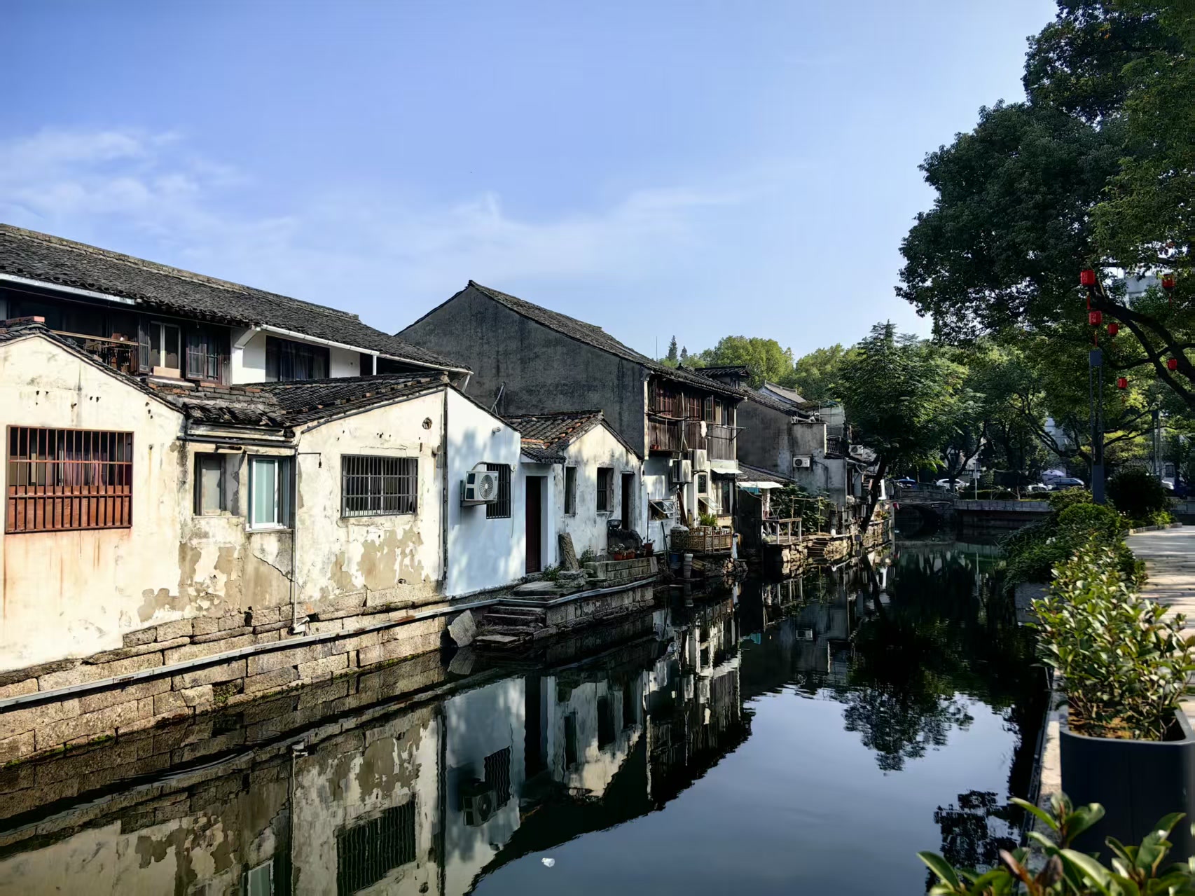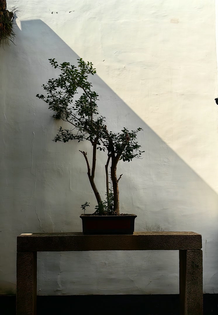 脚下的青石板路被无数足迹磨得温润如玉,在秋日柔和的阳光下泛着幽幽的光泽。石板缝隙里探出茸茸的青苔,翠绿欲滴,像为这条通往历史的小径绣上了绿色的花边。两侧是连绵的粉墙,那白色早已不新,雨水浸染,风日剥蚀,留下了深深浅浅、如水墨晕染般的痕迹,褐色的、灰色的、淡青的斑驳交错,像一幅巨大的、未完成的抽象画,每一笔都是时光的笔触。黛瓦如鳞,层层叠叠地覆在屋顶,沉静地肩负着数百年的风霜雨雪。瓦楞间的枯草在微风中轻轻摇曳,偶有几枝顽皮的桂花树探出墙头,那金黄细碎的花瓣,星星点点地洒在深色的瓦面上,平添了几分生气与画意。