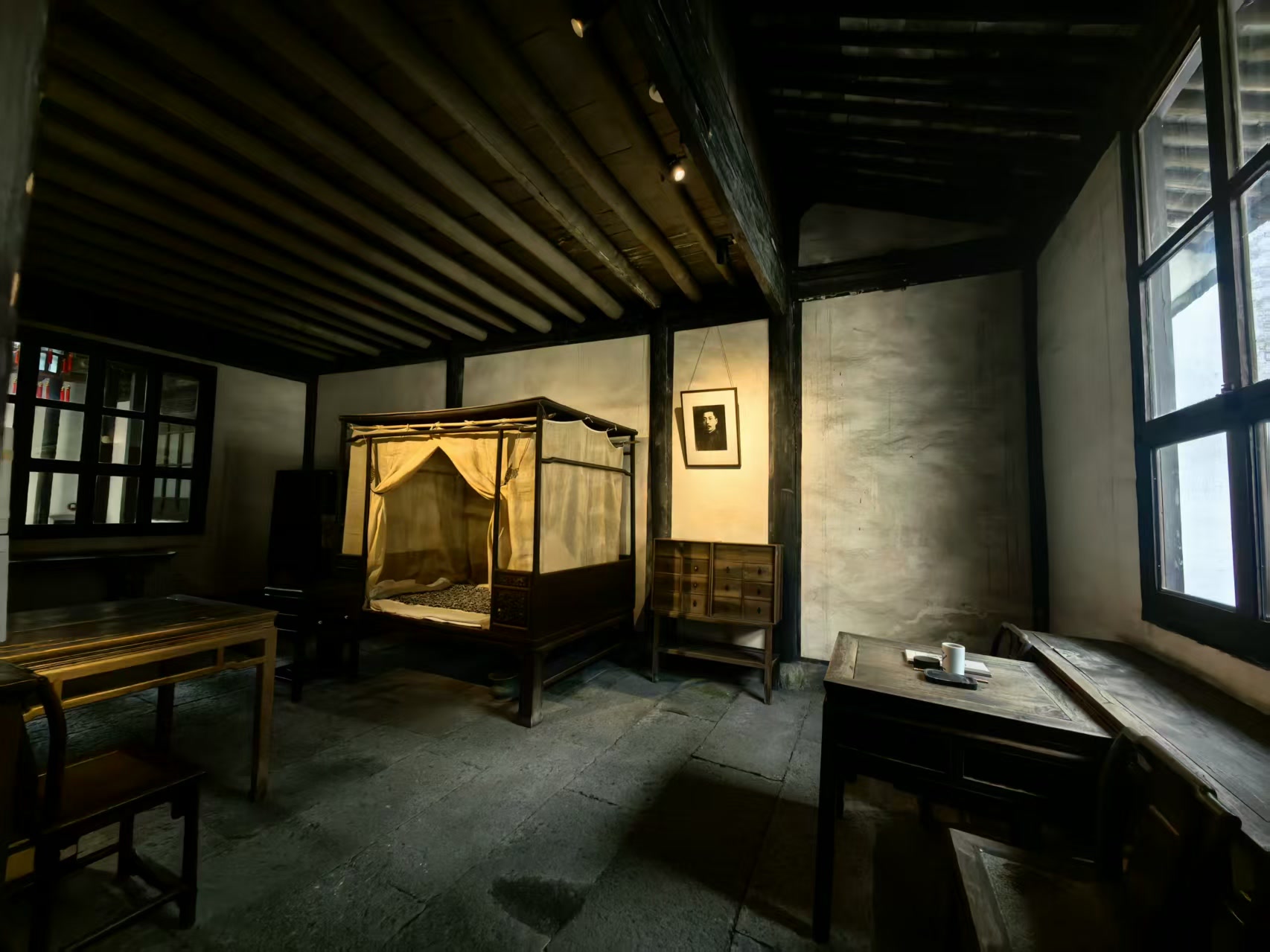 自然要去看看三味书屋。这是鲁迅少年时(约1892—1898年间)求学的地方。穿过拥挤的街道,踏入那道石库门,喧嚣似乎又被稍稍隔绝了一些。书屋比想象中更为狭小、朴拙。格局规整,正中悬挂着“三味书屋”的匾额,其下是一幅《松鹿图》,画面古旧,色彩暗淡。先生的座位设在画下,一张四方桌,一把太师椅,显得肃穆。学生的书桌则分散在四周,都是简陋的木桌。东北角上,便是那张闻名于世的、刻着“早”字的书桌。我隔着保护用的木质栏杆,俯身细看。桌面是深褐色的,油亮中透着岁月的包浆,留下了无数少年伏案苦读的痕迹。那个“早”字,刻得极深,笔画清晰,像一个烙印,也像一个誓言,深深地嵌入了木质的肌理,几乎要穿透桌板。据鲁迅在散文《从百草园到三味书屋》中的回忆,他因故迟到,受到先生批评,于是在书桌上刻下这个“早”字以自勉。我仿佛看见一个清瘦而目光沉静的少年,在父亲病重的阴霾与当铺柜台后冷眼的鄙夷中,默默地,用一把小刀,将一份突如其来的家庭责任、一股不甘人后的倔强,以及一份对未来的全部期许,一齐刻进了这木头的纹理里,也刻进了自己生命的骨骼中。窗外,依旧有隐隐的市声和桂花的香气飘来,但此刻闻着,那甜意里仿佛也掺入了一种孤愤的、警醒的苦味。这苦味,与墨池畔那纯粹艺术的沉静之“香”截然不同,它是挣扎的,是突围的,是“于浩歌狂热之际中寒,于天上看见深渊”的冷峻与清醒。