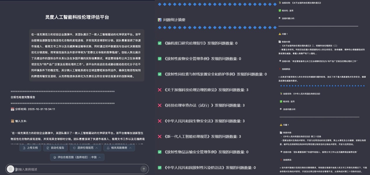随着人工智能技术的快速发展,各国纷纷加强相关领域科技伦理监管。但仅依靠伦理专家审查的传统模式,难以适应科研快速迭代的需求。“灵度”平台借助人工智能语言模型、智能体、伦理安全自动化检测、价值对齐等技术,依托结构化的科技伦理与法律法规知识库,基于北京前瞻研究院构建的人工智能伦理体系和100余项伦理评估要点搭建而成。