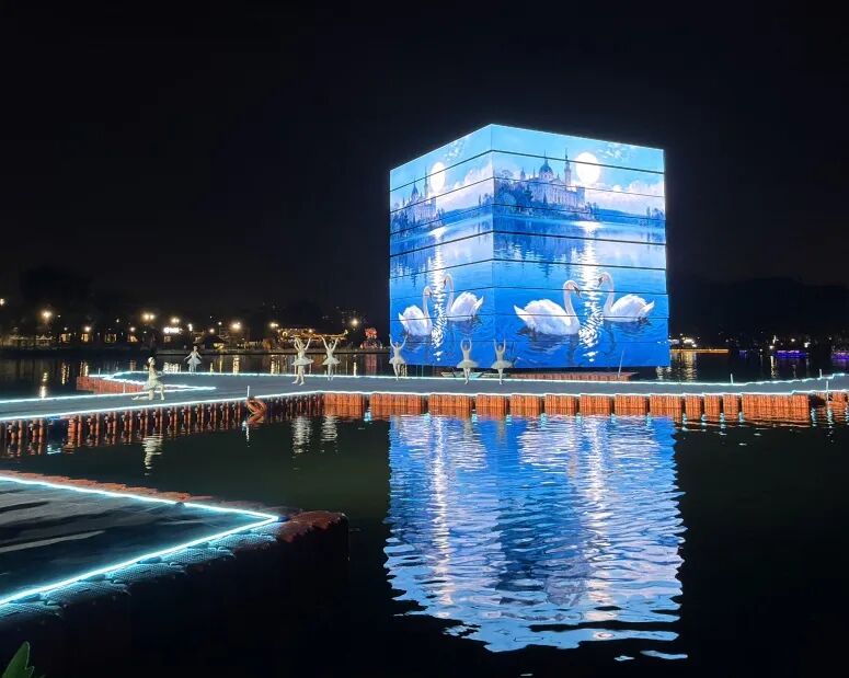 这场光影盛宴里,本土与国际的“双向奔赴”格外动人。本届灯光消费季邀请全球知名导演理查德·泰勒、国际灯光团队及中国雕塑家协会、中国“八大美院”等中外艺术家联合创作,全面展示夜朝阳的国际气质与潮流活力。“水上魔方”的环形浮台环绕LED立方,以“天圆地方”的美学呼应CBD天际线,打造了“会互动、有故事、可经营”的沉浸式场景;BBC Earth《地球脉动II》视听音乐会、“漂浮歌后”的水上歌剧,则让国际艺术元素落地朝阳,展现出“中国潮”与“国际范”的无缝融合;“365天和56个家”艺术装置以365个不锈钢球体内嵌各民族生活片段,向世界传递多元共生的中国故事;“国风与科技同框、天空与水影映衬”的“飞跃蓝湖”光影表演,既是东方传说的视觉呈现,又蕴含了哲学与文化故事……这种“国际元素+中国艺术”的创作逻辑,让技术与文化碰撞出跨越国界的吸引力。