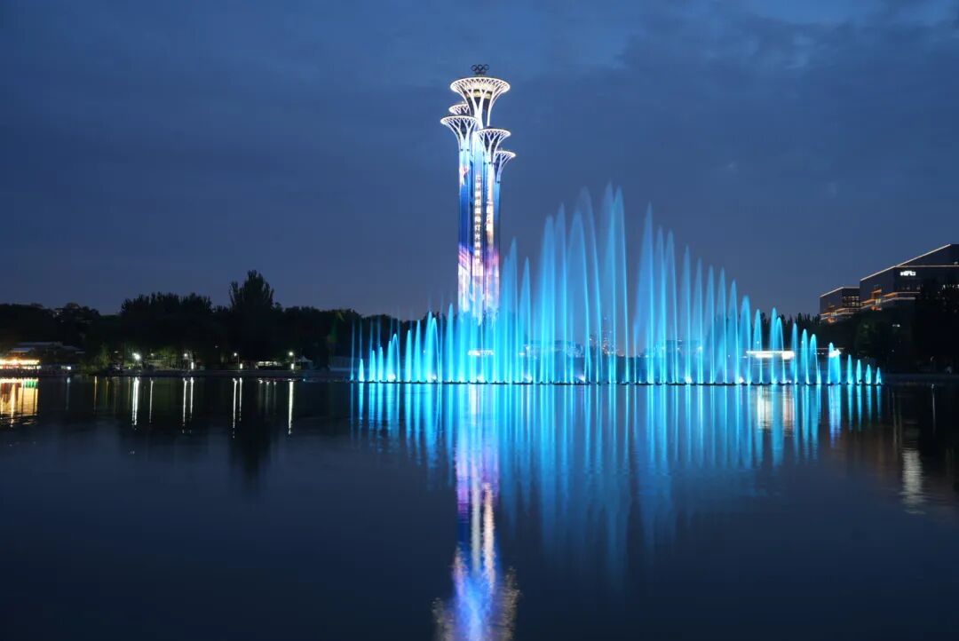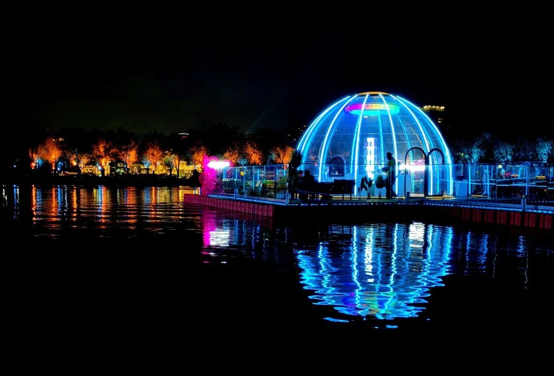 夜幕降临,朝阳的夜空被一束束灵动的光影点亮。在朝阳公园贝壳剧场的静谧水面上,“飞跃蓝湖”光影表演将亮马河的夜晚编织成一场贯通水、路、空的三维神话;北湖上的“水上魔方”映照着最美天际线,虚实交织间,勾勒出北京金秋最动人的夜色。这已不仅仅是一场光影盛宴,更是一次心灵的共鸣、艺术的对话。