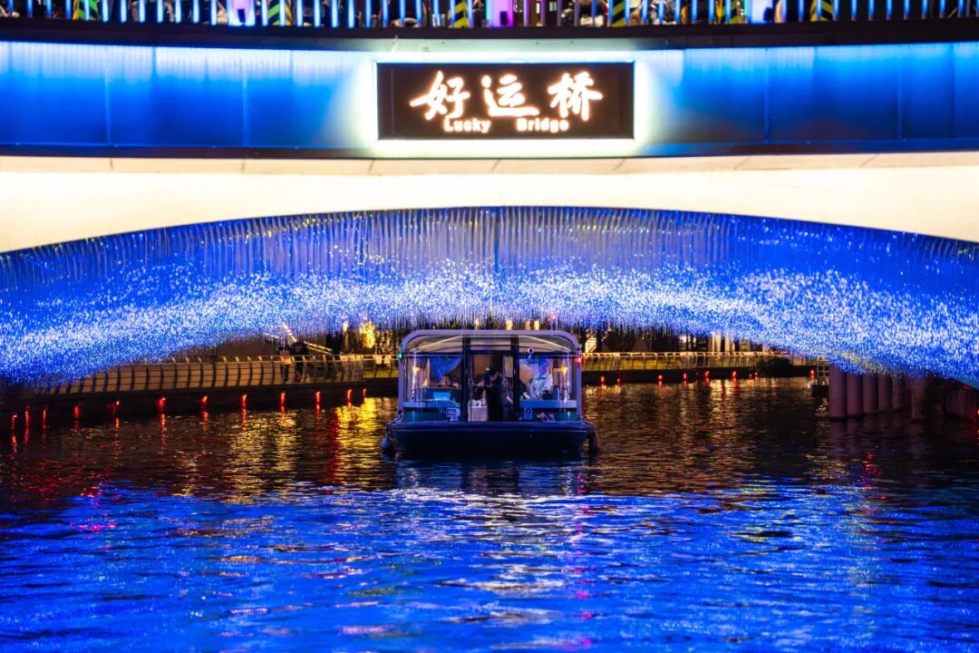 空间的开放布局,让这份活力渗透城市的每一条肌理。今年的灯光消费季以“Together! We Shine! 一起闪耀”为年度特色主题,以亮马河文化经济带与奥林匹克中心区为两大核心阵地,联动三里屯、CBD、大望京、朝外UIC、高碑店等六大片区及重点商圈,形成“两核六心”的总体布局。核心区域共设53处专属特色场景,装置布于水面、水岸、地面、楼体,构成立体沉浸式夜游矩阵。“两核六心”的布局经过三年沉淀,勾勒出国际化城区的开放轮廓,让朝阳成为名副其实的“世界会客厅”。精心策划的布局和动线既具有国际化的地域属性,又增强了空间的可读性和文化的凝聚力:从车行的楼宇光影到船行的河上景致,从步行的街角惊喜到园区的沉浸演出……当人们在通勤、散步中不经意撞见光影,便会自然生出“原来朝阳的夜晚如此丰富”的感知,这种“自然融入”的体验,正是城市美学与消费潜力的隐性传递。