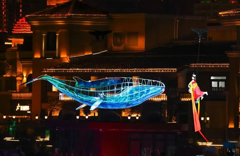 “因地制宜”的设计巧思,使光影自然融入城市肌理。中规院北京光影中心主任李丽表示:“灯光消费季期间,每一个场景都是通过最新的光影科技智能化控制完成,让人们感受到处处有科技范儿、国际范儿。”然而对于科技的运用,设计团队却极为“克制”,为避免“科技堆砌”,他们坚守两大原则:一是激活工业遗存,让老建筑焕发新生。废弃的工业龙门吊被改造成“遇见”装置,轨道成为光影的“移动舞台”;闲置的气罐被赋予新生命,成为“奇幻摩球”的载体。二是传承本土IP,让文化记忆持续延续。三年来,“吉凤朝阳”“超级靓马”“靓靓”等数字IP不断迭代,今年的“凤羽投影”“百鸟伴凤”与去年的“凤凰飞舞”形成记忆联动。这种设计不执着于“惊艳一时”,而是致力于“融入日常”,让光影温暖陪伴市民每一晚。