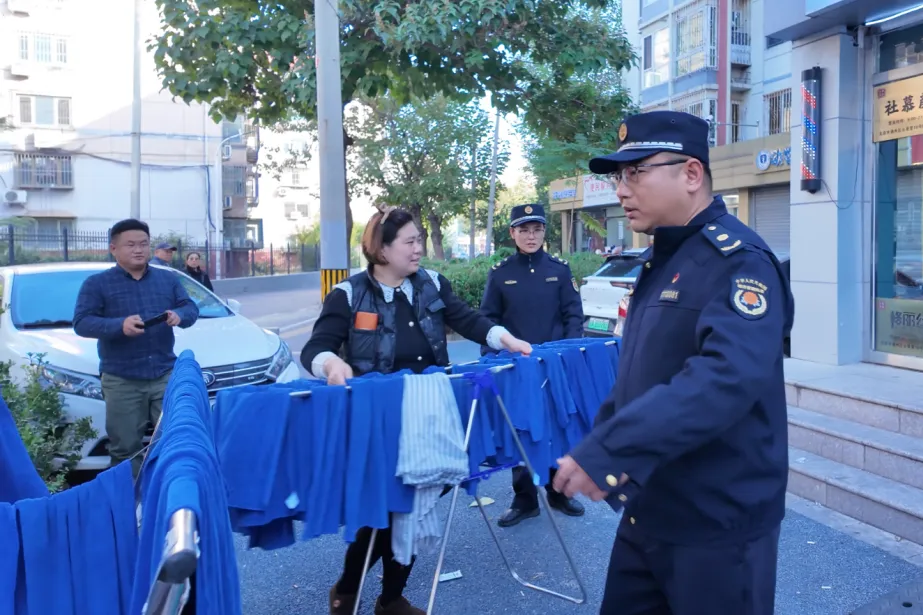 14点56分:经快速勘查,执法队员责令当场整改违规行为,协助清理占道毛巾,处置完成后及时电话告知居民。