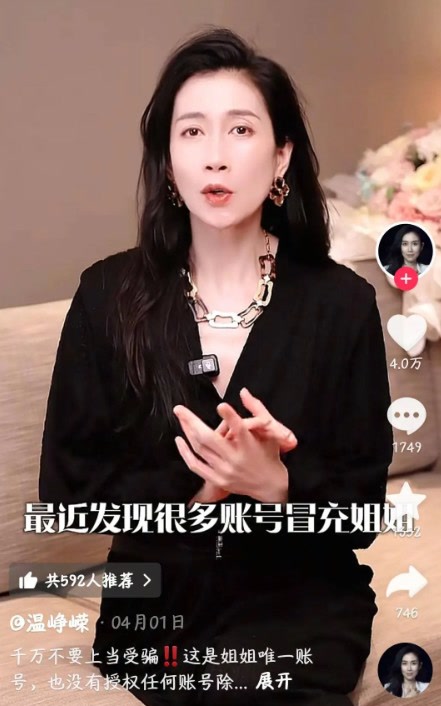 近日,演员温峥嵘同时“现身”多个不同直播间,推广不一样的产品引发网友关注。据扬子晚报报道,网上出现了“赛博温峥嵘”大军,尽管“温峥嵘”推荐的品牌产品不同,话术却是同一套。甚至,刘涛、张柏芝、舒淇、戚薇等女明星都为温峥嵘宣传的某款面膜“站台”。有粉丝透露,自己一天就举报了18个“温峥嵘”直播间,“根本举报不过来,举报一个又新增一个”。