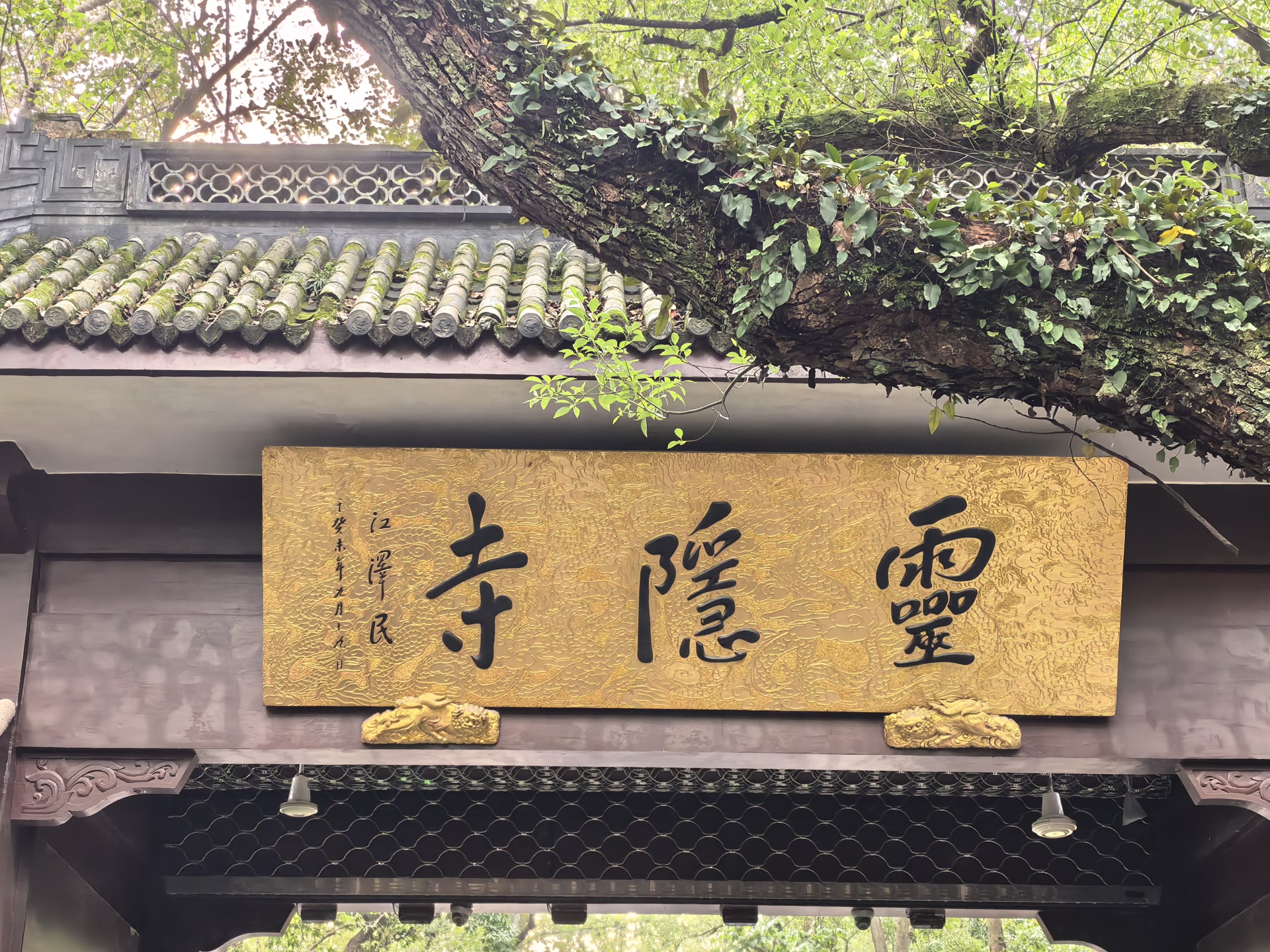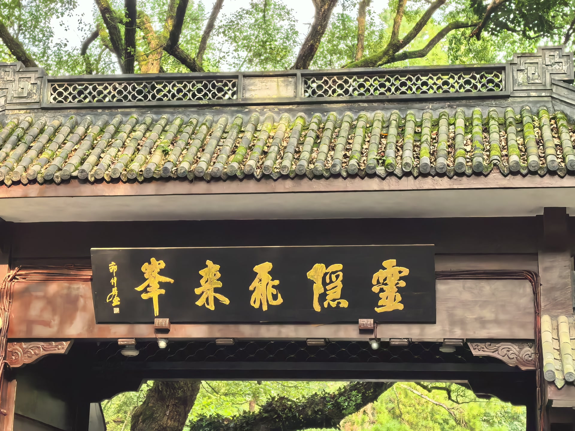 终于望见那座始建于东晋咸和元年(326年)的山门。印度僧人慧理云游至此,见山峰奇秀,叹曰:“此乃中天竺国灵鹫山之小岭,不知何以飞来?”遂面山建寺,取名“灵隐”。此刻,“云林禅寺”的匾额在雨后初晴的阳光下格外分明,这是康熙皇帝御笔亲题,在晨曦中泛着金光。飞檐上的鸱吻还挂着晶莹的水珠,在暖阳下闪烁着千年不改的光芒。檐角的铃铛在微风中发出清脆的声响,仿佛在诉说着千年的故事。