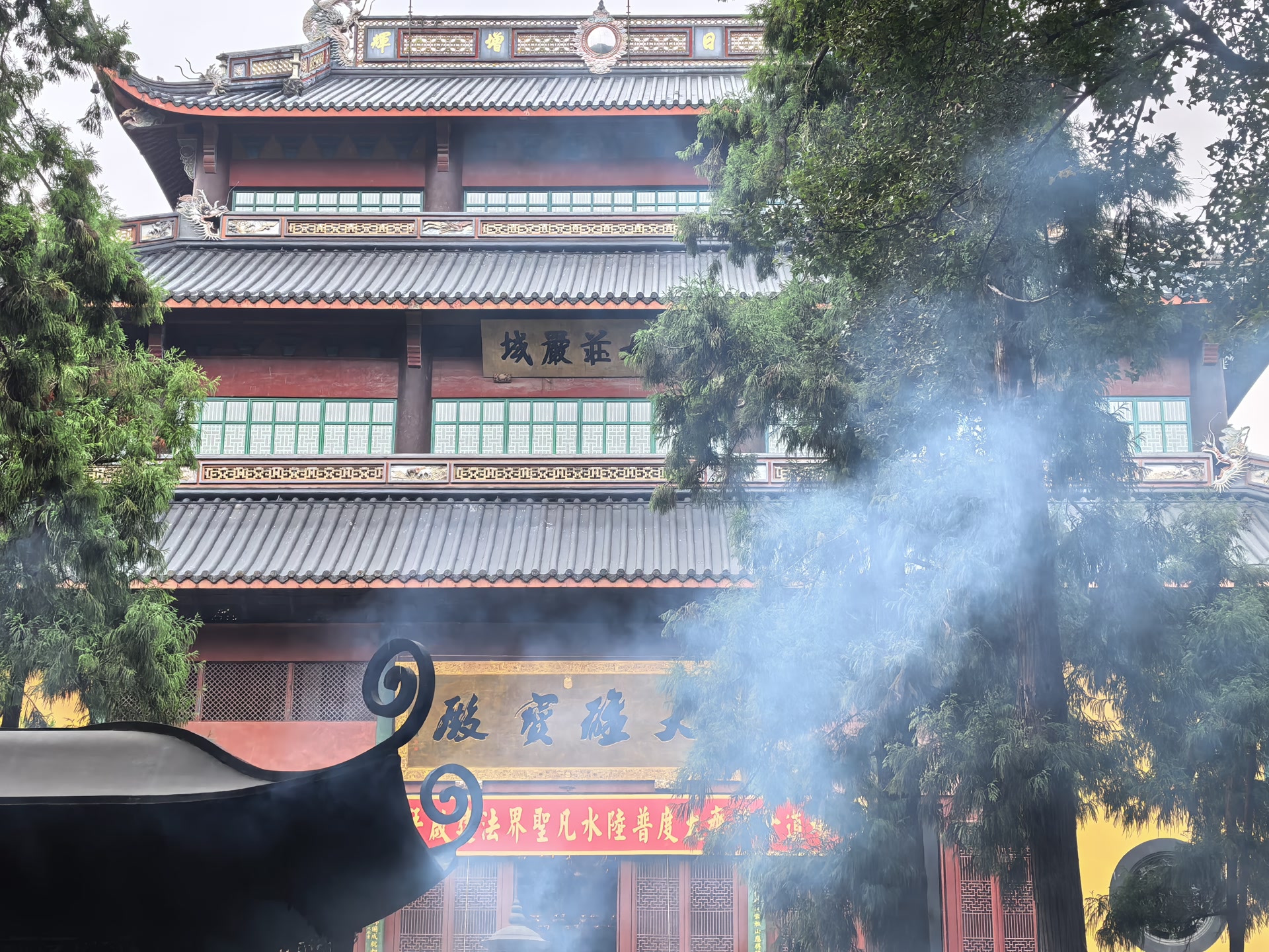 迈进寺门,一股温热的气息扑面而来。大雄宝殿是清宣统二年(1910年)重建的,重檐庑殿顶的雄浑气势,让人肃然。殿顶的琉璃瓦在雨水的冲洗后显得格外鲜亮,屋脊上的仙人走兽栩栩如生。殿内供奉的释迦牟尼坐像高24.8米,是用24块香樟木雕刻而成,金碧辉煌,宝相庄严。佛像的面容慈祥中带着威严,双目微垂,仿佛在俯视着芸芸众生。香炉前,青烟袅袅升起,在晨光中形成一道道柔和的光柱。我看着一位老妇人,将三炷香举过头顶,极其郑重地三鞠躬。她的手指因岁月的打磨而粗糙,但动作却异常轻柔,仿佛怕惊扰了什么。这虔诚的姿态,与南宋吴自牧在《梦粱录》中记载的“每逢朔望,诸寺院各有香会,善男信女不绝于途”的场景,何其相似。