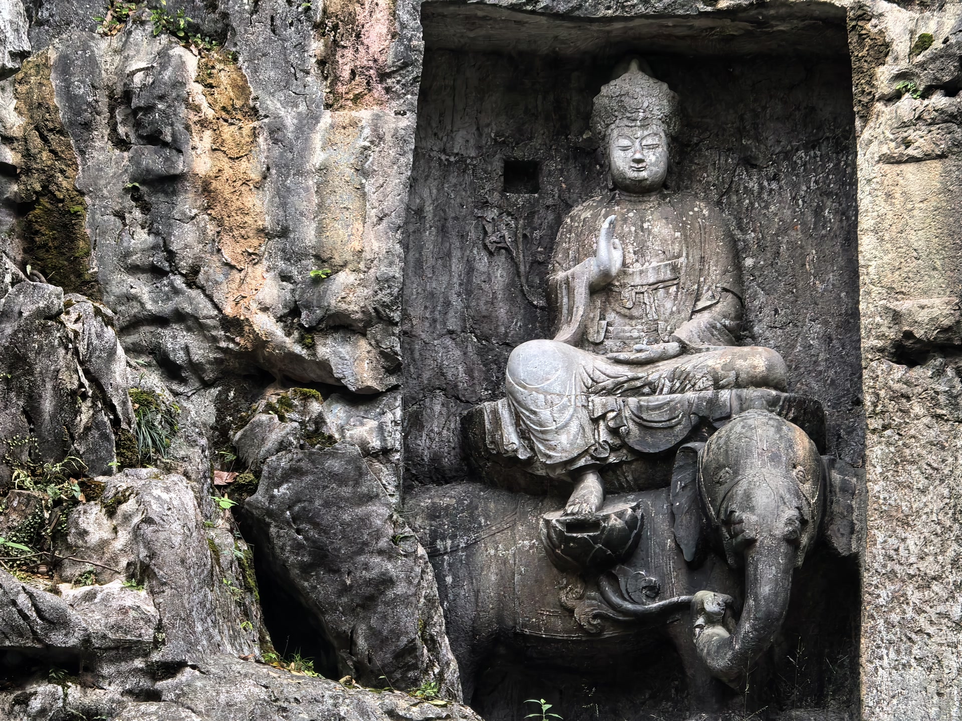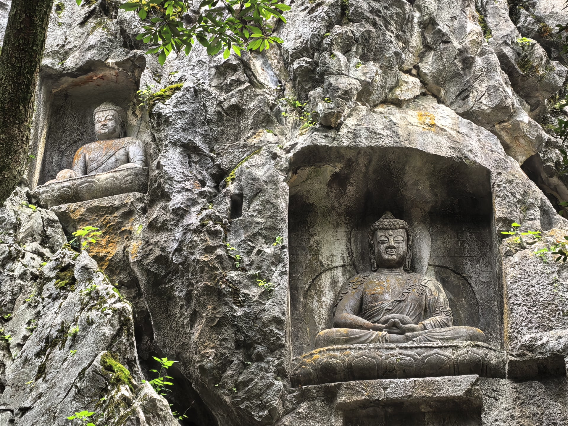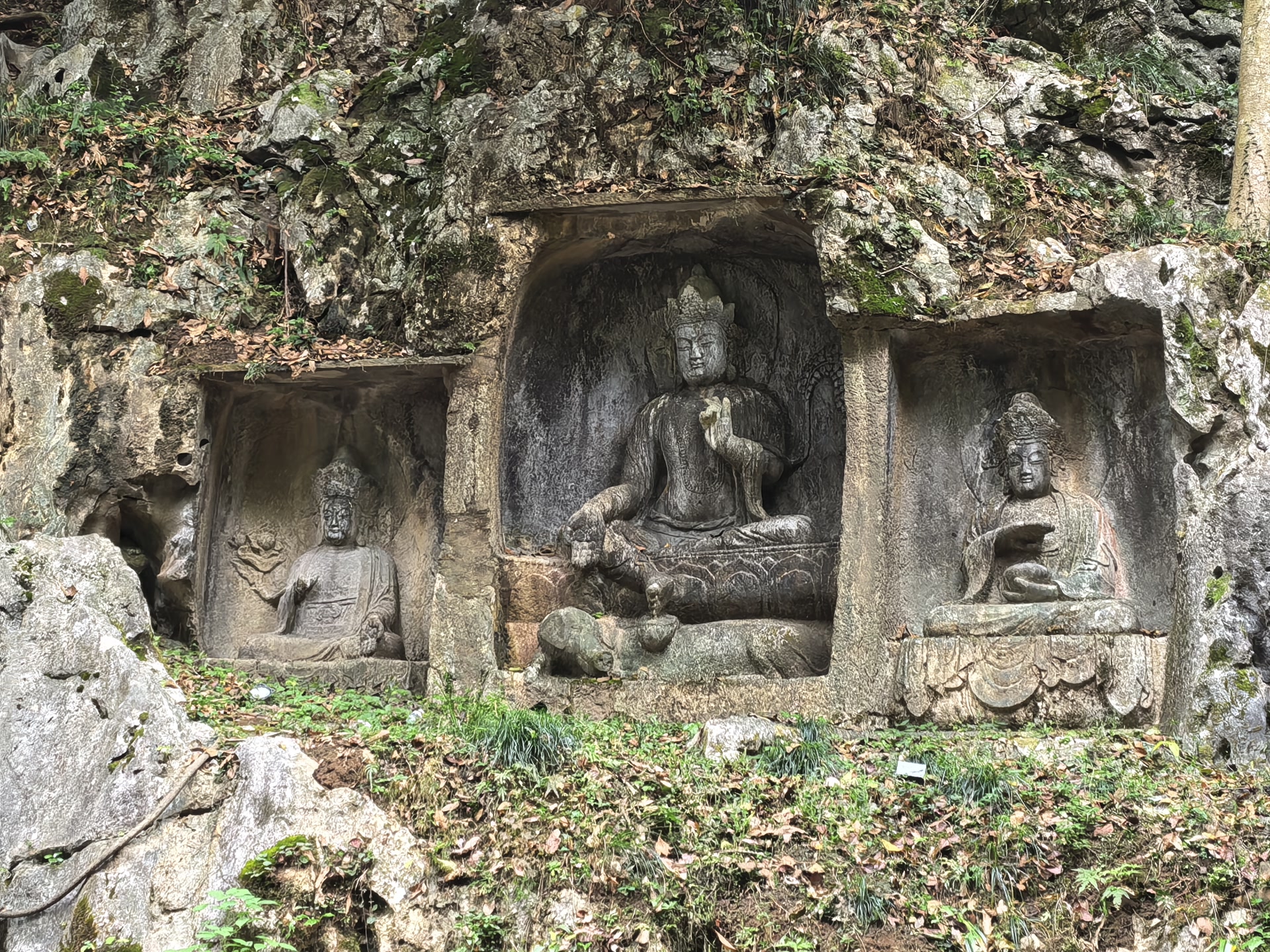 最让我驻足的是那尊元代的金刚手菩萨像(雕刻于公元1282年)。这是典型的藏传佛教造像,三头八臂,怒目圆睁,是元朝帝师八思巴的弟子在杭州弘扬藏传佛教时留下的珍贵遗迹。菩萨的每只手臂都持有不同的法器,虽然有些已经残缺,但依然可以看出当年雕刻的精细。伸手轻触冰凉的岩壁,指尖仿佛触到了历史的脉搏——从五代吴越国的汉传佛教,到元朝的藏传佛教,都在这一方岩壁上留下了印记。
