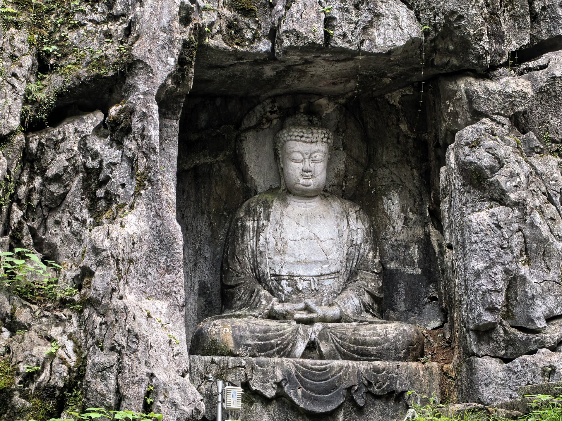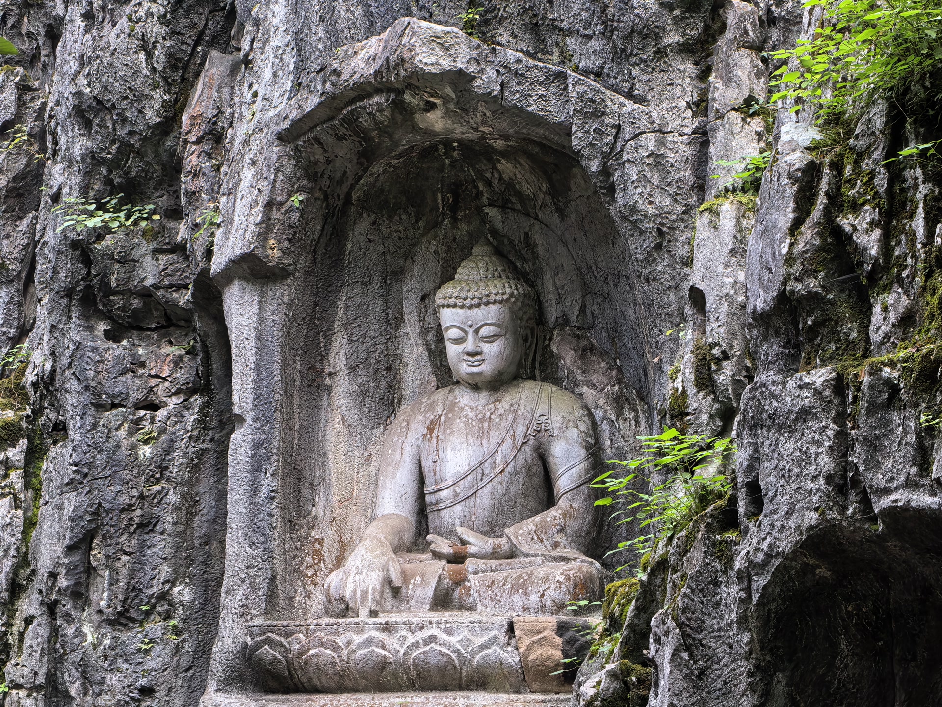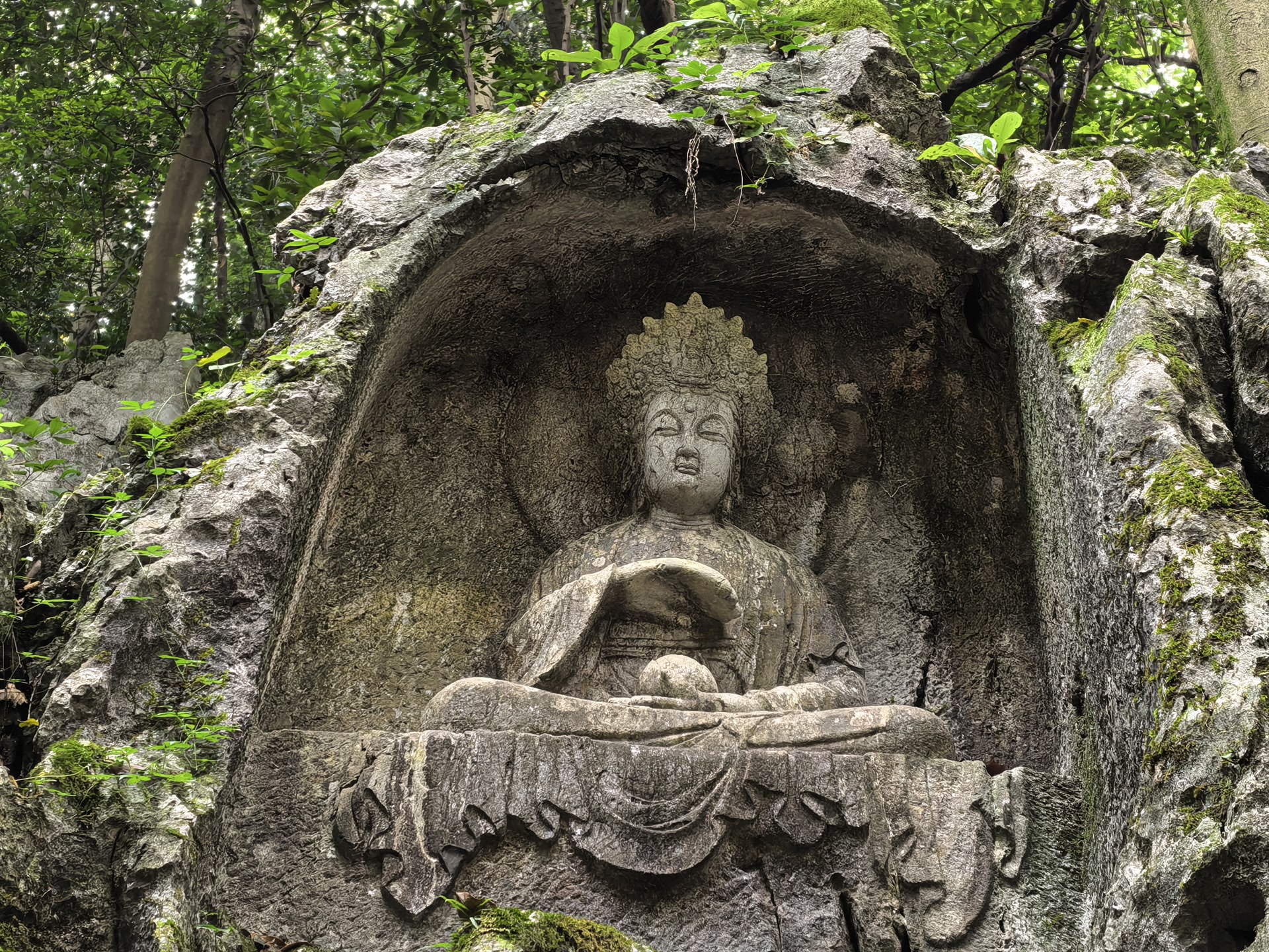 最让我驻足的是那尊元代的金刚手菩萨像(雕刻于公元1282年)。这是典型的藏传佛教造像,三头八臂,怒目圆睁,是元朝帝师八思巴的弟子在杭州弘扬藏传佛教时留下的珍贵遗迹。菩萨的每只手臂都持有不同的法器,虽然有些已经残缺,但依然可以看出当年雕刻的精细。伸手轻触冰凉的岩壁,指尖仿佛触到了历史的脉搏——从五代吴越国的汉传佛教,到元朝的藏传佛教,都在这一方岩壁上留下了印记。