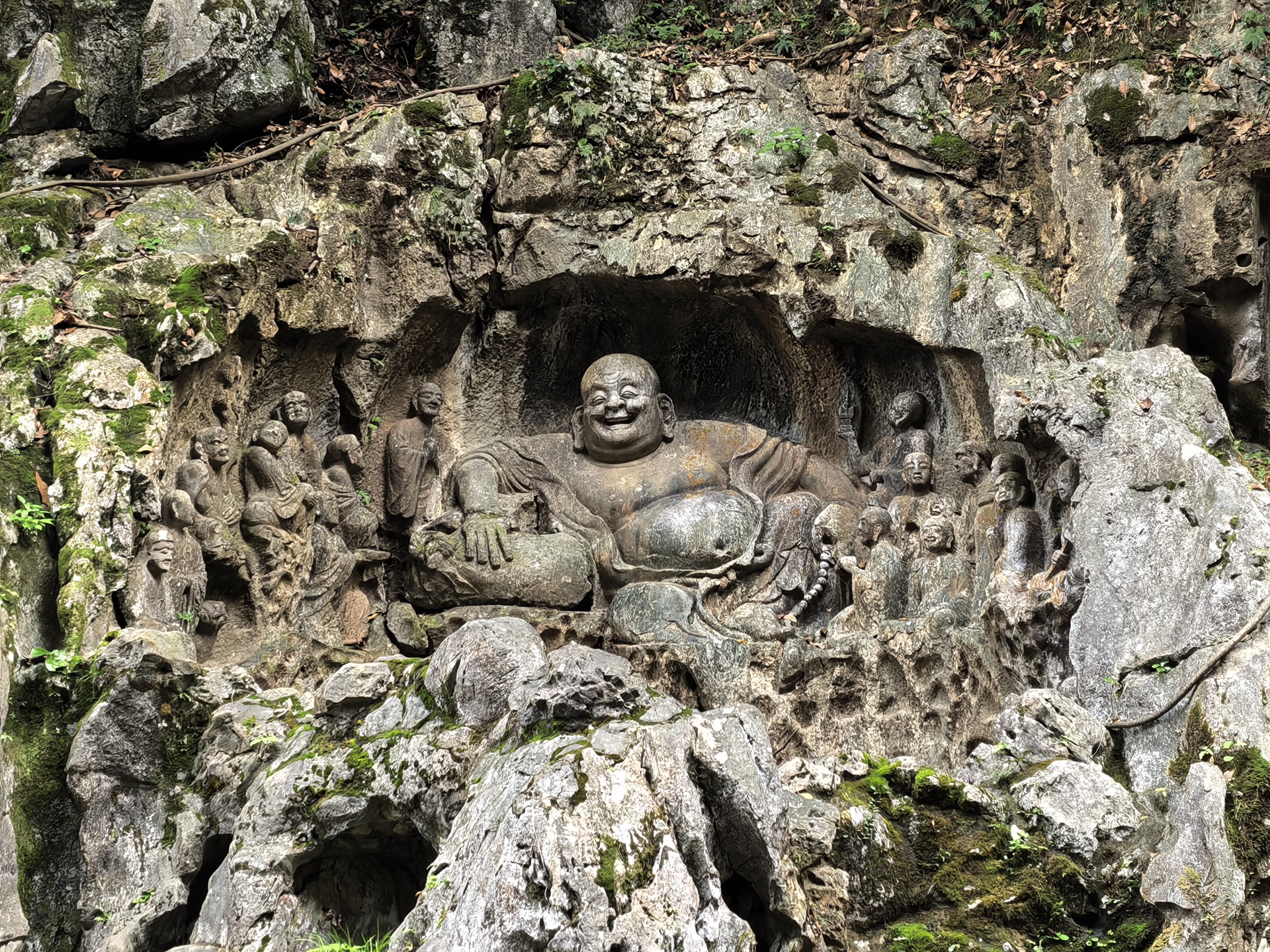 青林洞口,北宋乾兴元年(1022年)雕刻的卢舍那佛会浮雕依然清晰。十七尊造像栩栩如生,衣纹流畅,见证了北宋石刻艺术的巅峰。佛像的面容圆润丰满,眉目细长,嘴角带着若有若无的微笑,是典型的宋代造像特征。而那尊著名的南宋弥勒佛(创作于公元1000年左右),坦着丰腴的肚皮,笑得酣畅淋漓。这笑容,已经在这里绽放了千年。佛像的右手抚膝,左手持念珠,双耳垂肩,衣褶自然流畅,仿佛随时都会站起身来。周围的石壁因为常年雨水冲刷,已经变成了深褐色,更衬托出佛像的庄严。