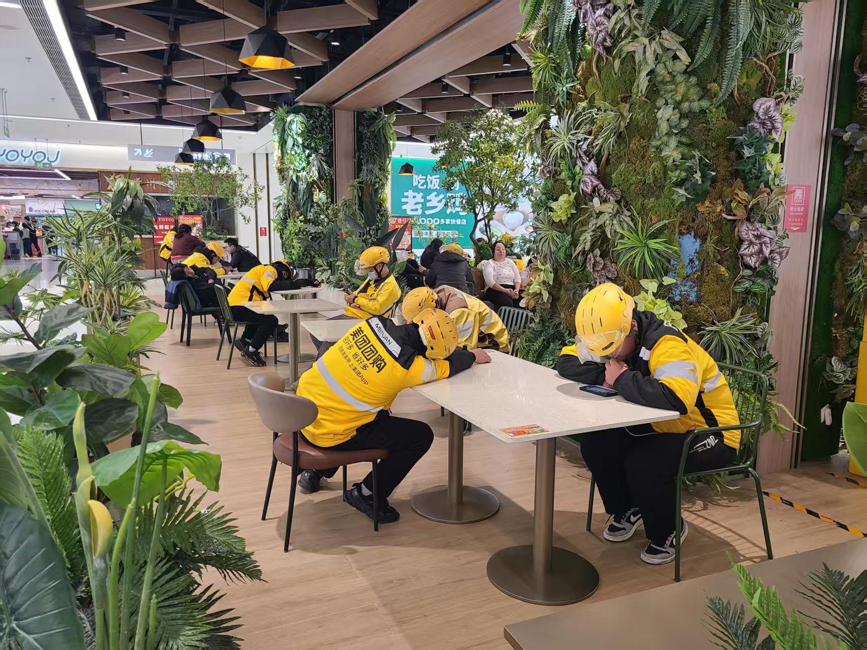 据了解,悠唐购物中心外卖订单量巨大,仅美团悠唐站日均订单就达3500单,近百名骑手每日在此往返奔波。为了更好地服务新就业群体,商场将原本可出租的“黄金摊位”改造为休息区,设在地下一层的中心位置,紧邻扶梯与热门商户,方便骑手休息和随时接单。