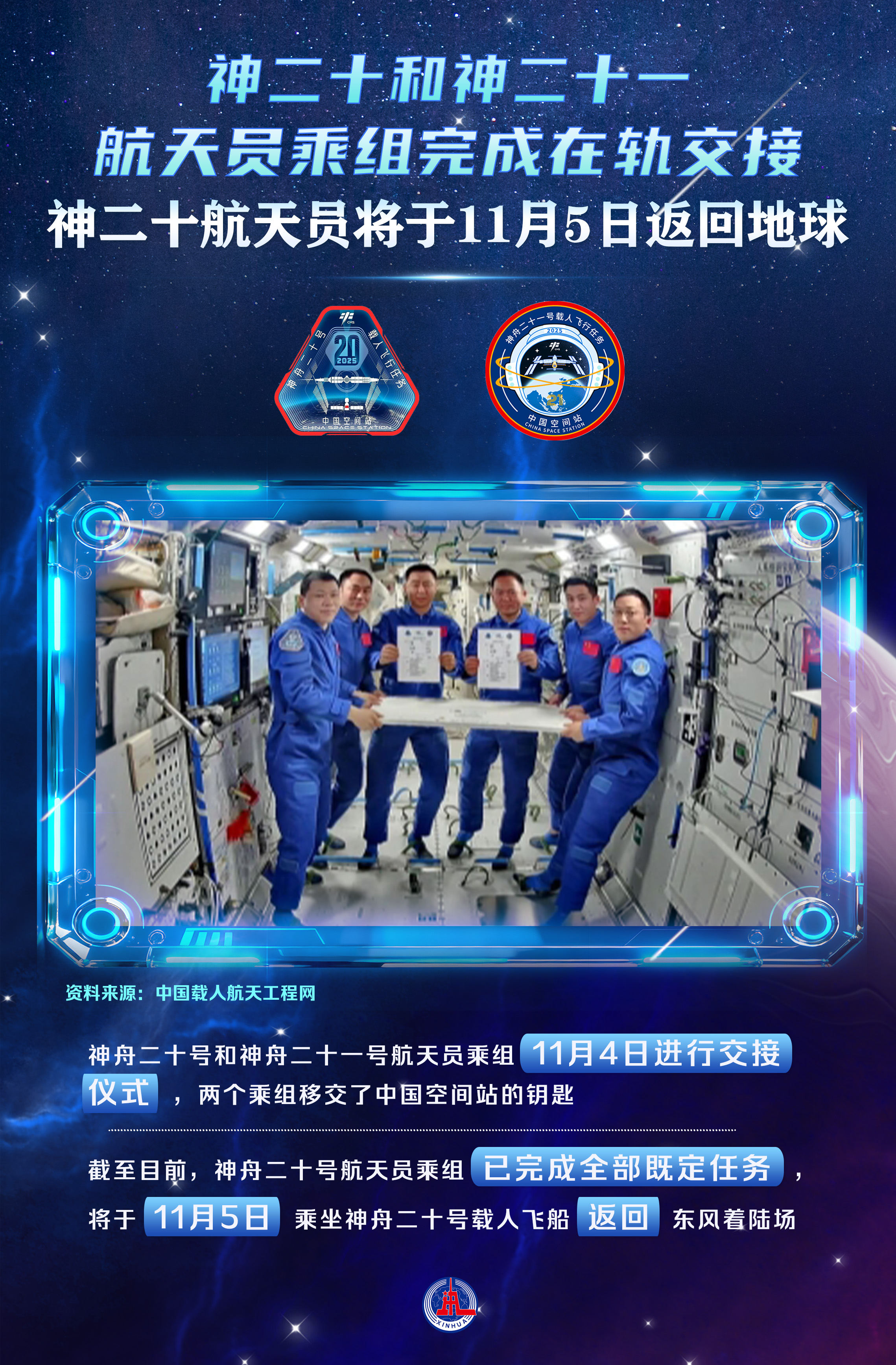 新华社快讯:神舟二十号航天员乘组将于11月5日返回地球。