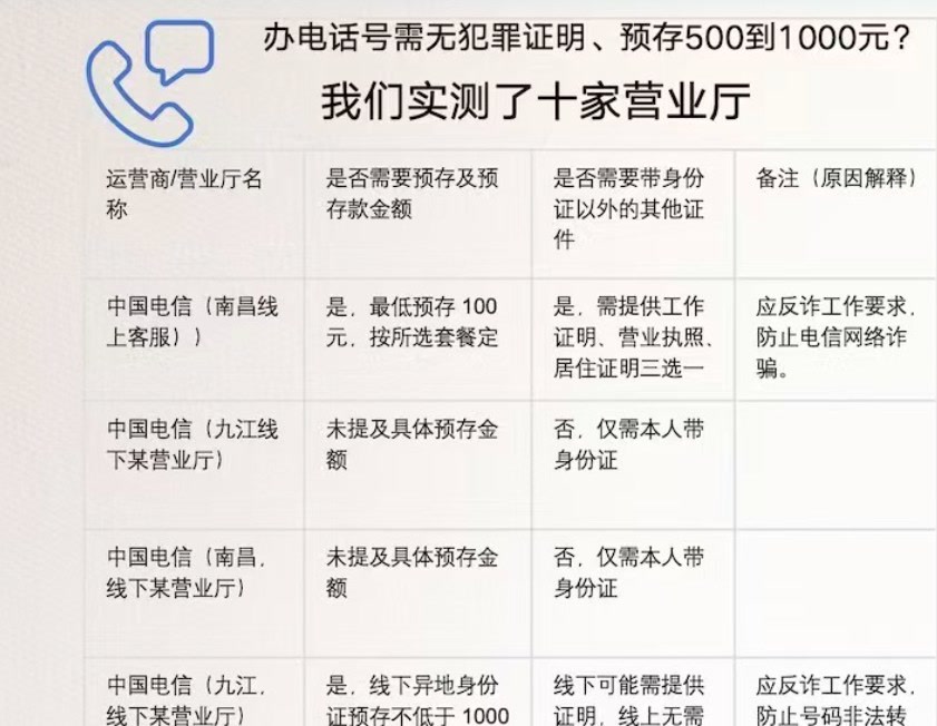 办张电话卡,竟有诸多奇葩要求。据澎湃新闻报道,在江西等地通信营业厅办理电话卡,需要提供无犯罪证明、工作证明或银行流水中的一项。营业厅解释称,这是应反诈工作要求。