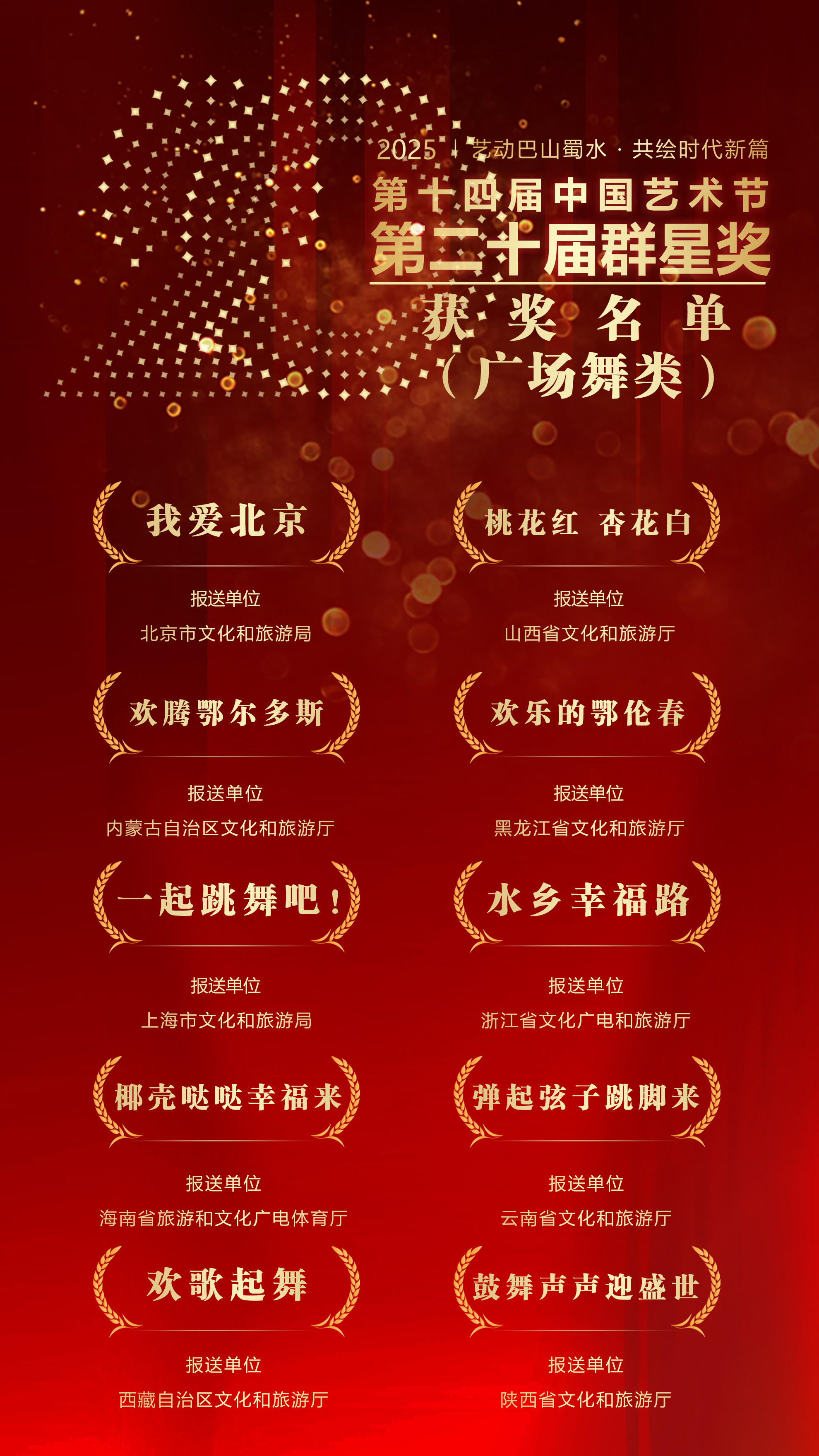作为中国群众文艺领域的最高政府奖,本届群星奖共有1996个演出单位的5039个作品(团队)、29.5万群众文艺工作者参评,经过初选、复评及终评,最终从全国报送的数千部作品中评选出60个获奖作品(团队),音乐、舞蹈、戏剧、曲艺、广场舞、群众合唱各10个。