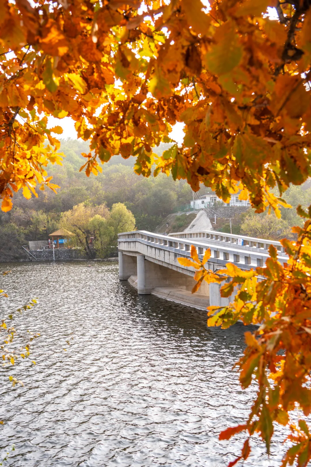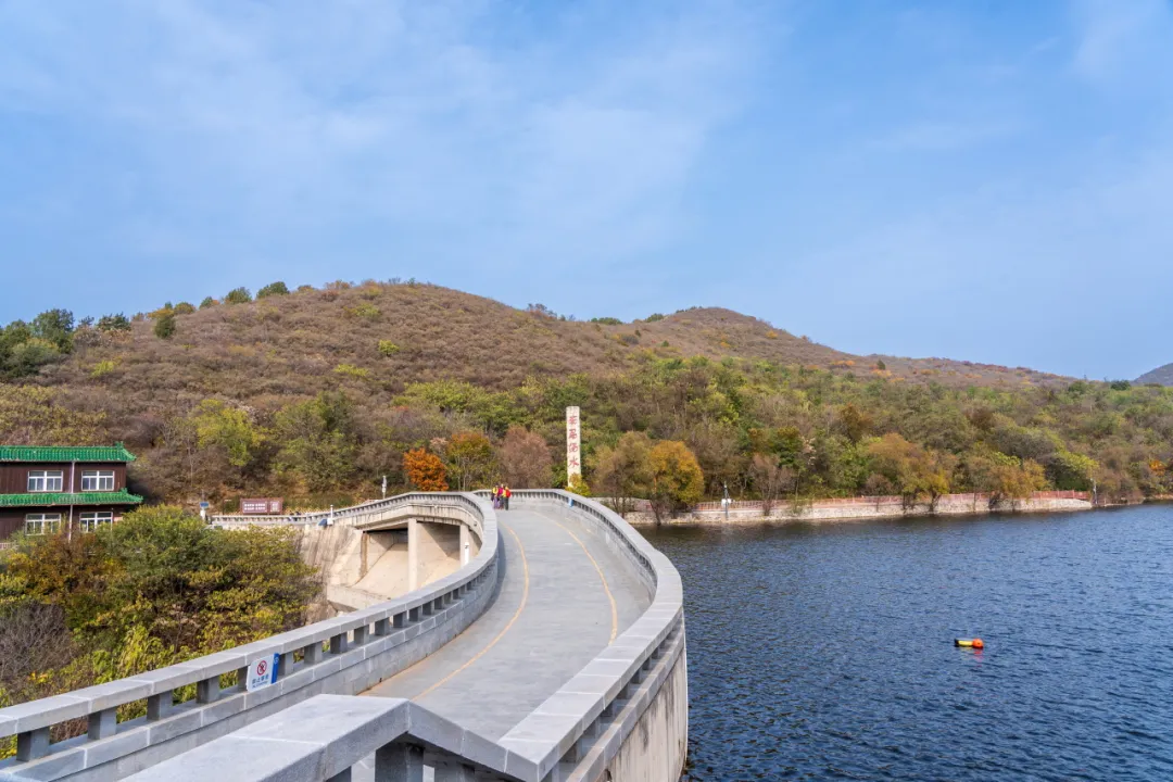 从绿道一路行至天泰湖畔,登上大坝视野豁然开朗。秋从山林跨越到湖面,一泓碧水,波光粼粼,将湛蓝的天、洁白的桥与斑斓的山悉数收纳。