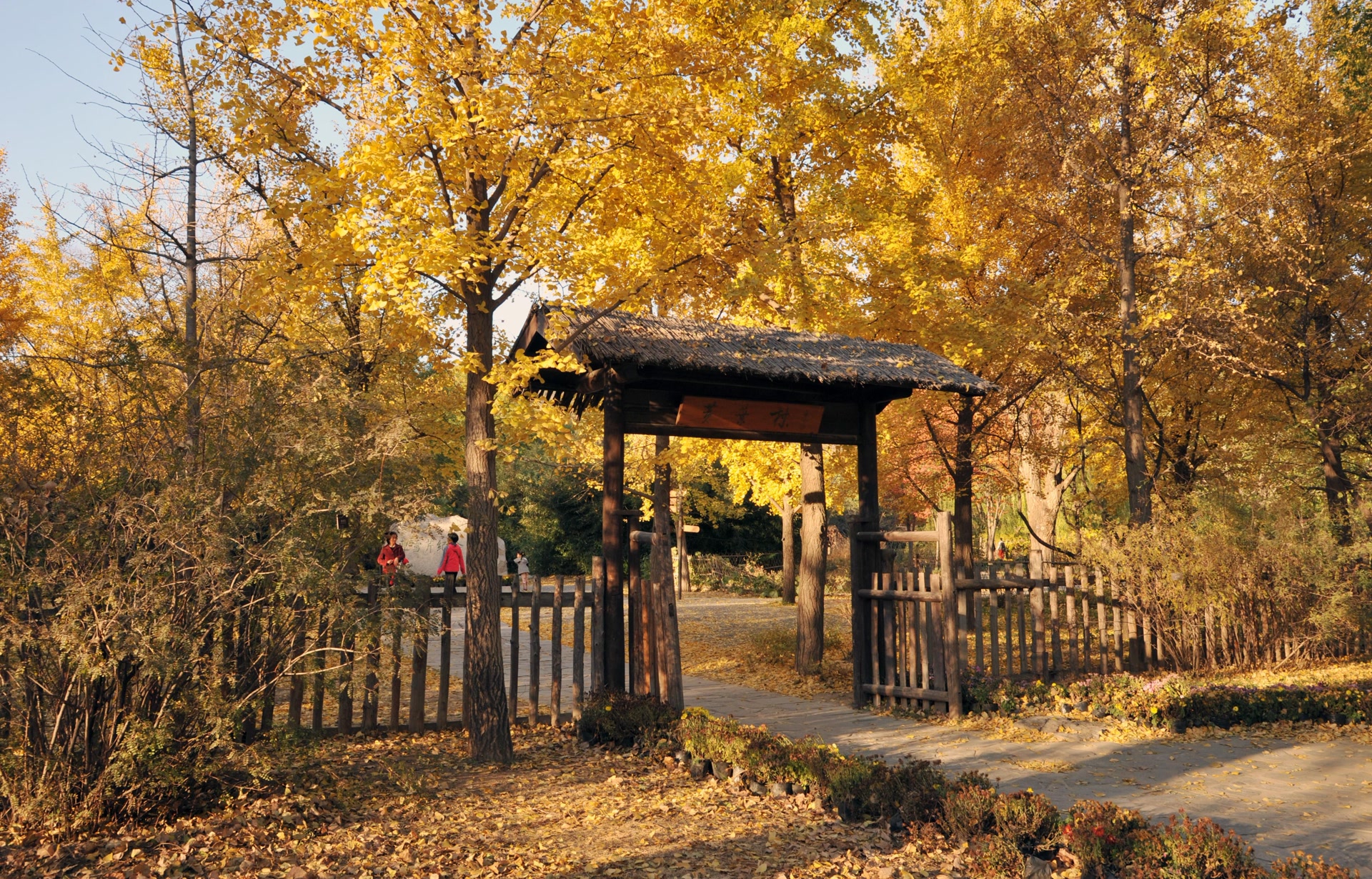 信步园中,一座古朴拙美的原木小桥横跨于尚未结冰的湖面。对岸,一隅村舍在疏朗的林木间若隐若现。虽无鸡鸣犬吠,亦少见炊烟,但这俗中含雅的山野趣味,却自有一种世外桃源的超然,引人入胜。村前,一扇以黄草覆顶、样式简朴的单挑原柴门静静伫立,门额上,“黄叶村”三个绿色清瘦的大字,仿佛在向游客低声诉说一段尘封的往事。