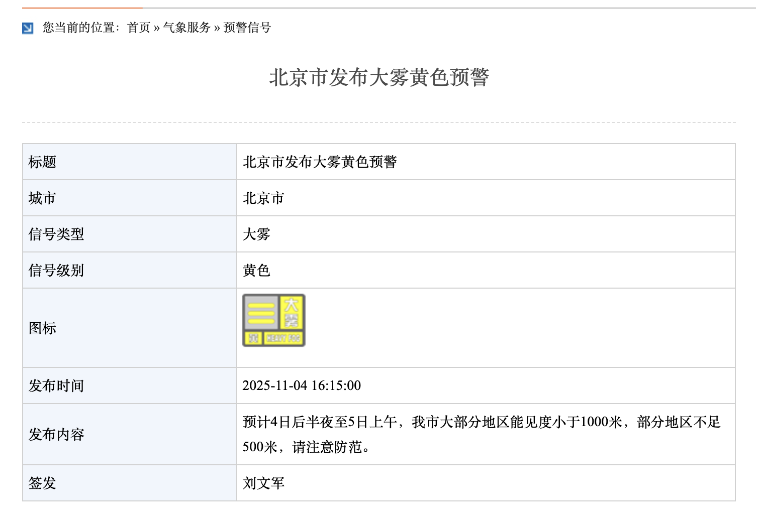 部分地区能见度不足500米!北京发布大雾黄色预警