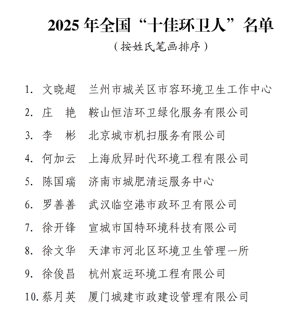 住房城乡建设部城市建设司相关负责人介绍,住房城乡建设部自2025年起将每年开展全国“十佳环卫人”宣传选树活动,旨在树立行业榜样,激励一线队伍,增强环卫工人的职业荣誉感与行业归属感,同时,生动展示新时代环卫人甘于奉献的敬业精神和勇于创新的时代风采,展现行业形象,强化社会认同,引导社会各界更加支持环卫工作,关心关爱环卫工人。