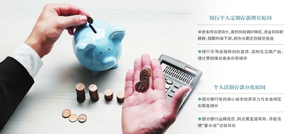 融360数字科技研究院高级分析师艾亚文指出,个人定期存款普遍高增反映了居民资产配置意愿发生了改变。究其原因,一方面,从投资者角度来看,资本市场波动加剧背景下,居民风险偏好降低,资金从权益类资产向存款类产品转移,市场普遍预期存款利率将进一步下调,也在推动居民通过长期限存款锁定当前收益;另外一方面,从银行角度来看,银行为改善净息差,引导活期产品转向权益类、结构化定期产品;此外,银行通过营销手段促使客户续存部分即将到期的高息存款,进一步推高定期存款规模。