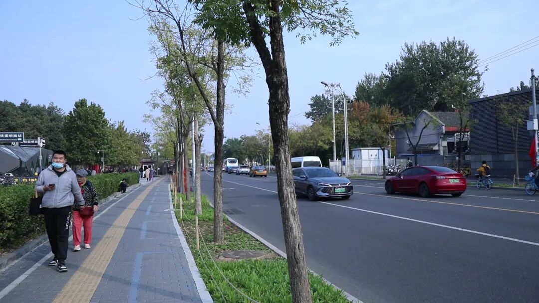 在圆明园地铁站旁的景观广场上,几位居民正带着孩子在树荫下玩耍。“以前这地方行人和自行车交错行进,改造后安全多了。”市民李女士表示,“周末带孩子去圆明园,出来就能在这儿歇脚,看着干净的街道和漂亮的花,心情都变好了。”常来附近写生的大学生王同学则对景观细节赞不绝口:“道路绿化和圆明园的园林风格很协调,新增的口袋广场成了绝佳的写生点,既能看到车流有序的城市活力,又能感受历史遗产的静谧。”