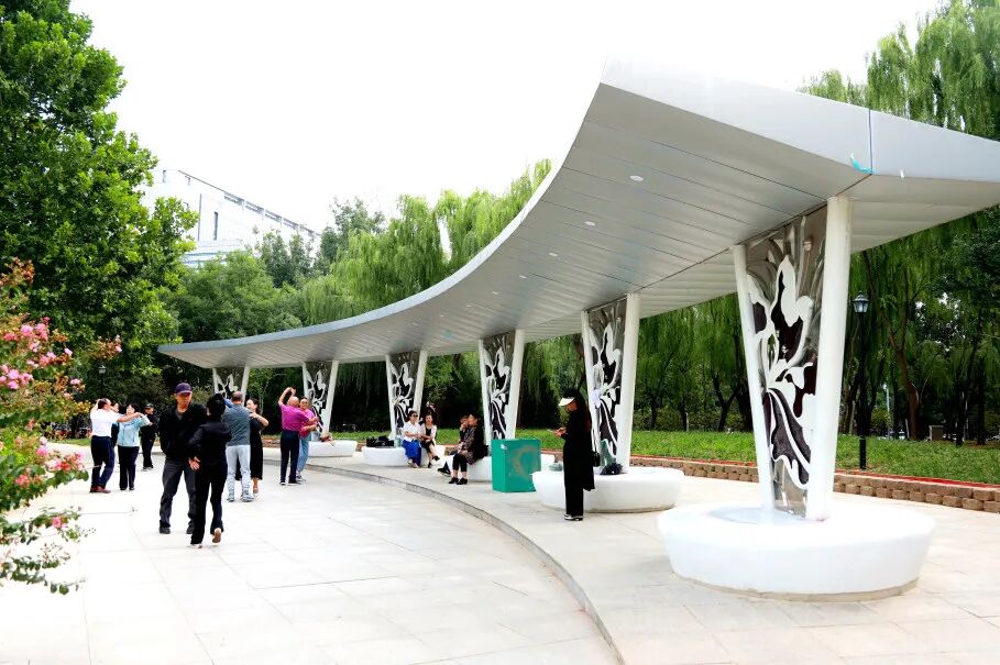 造型新颖的景观廊架、丰富的健身器材、贴心实用的无障碍设施,打造户外休憩与混龄交往空间,方便邻里聊天互动,提升游园体验。